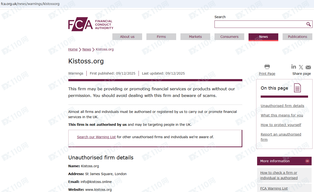 因未經授權許可提供金融產品投資服務,Kistoss已被英國FCA列入警示黑名單,請遠離!