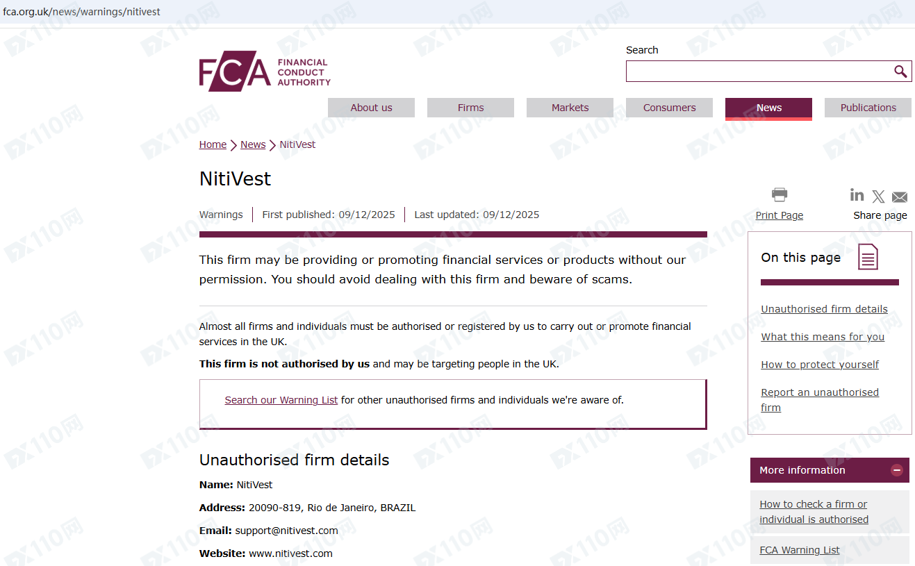 因未經授權許可提供金融產品投資服務,Nitivest已被英國FCA列入警示黑名單,請遠離!