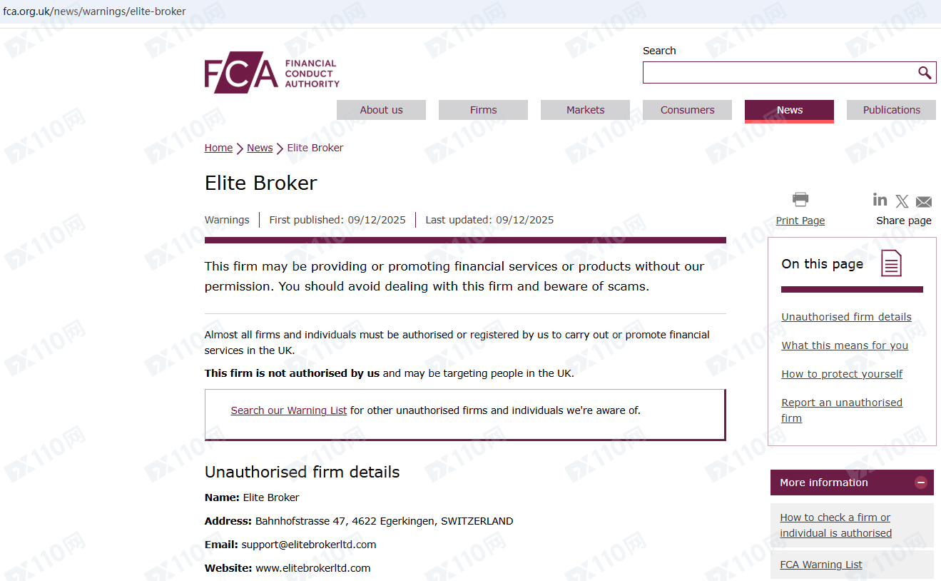 因未經授權許可提供金融產品投資服務,Elite Broker已被英國FCA列入警示黑名單,請遠離!