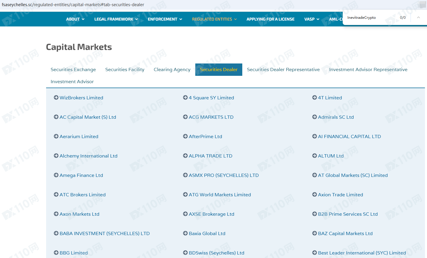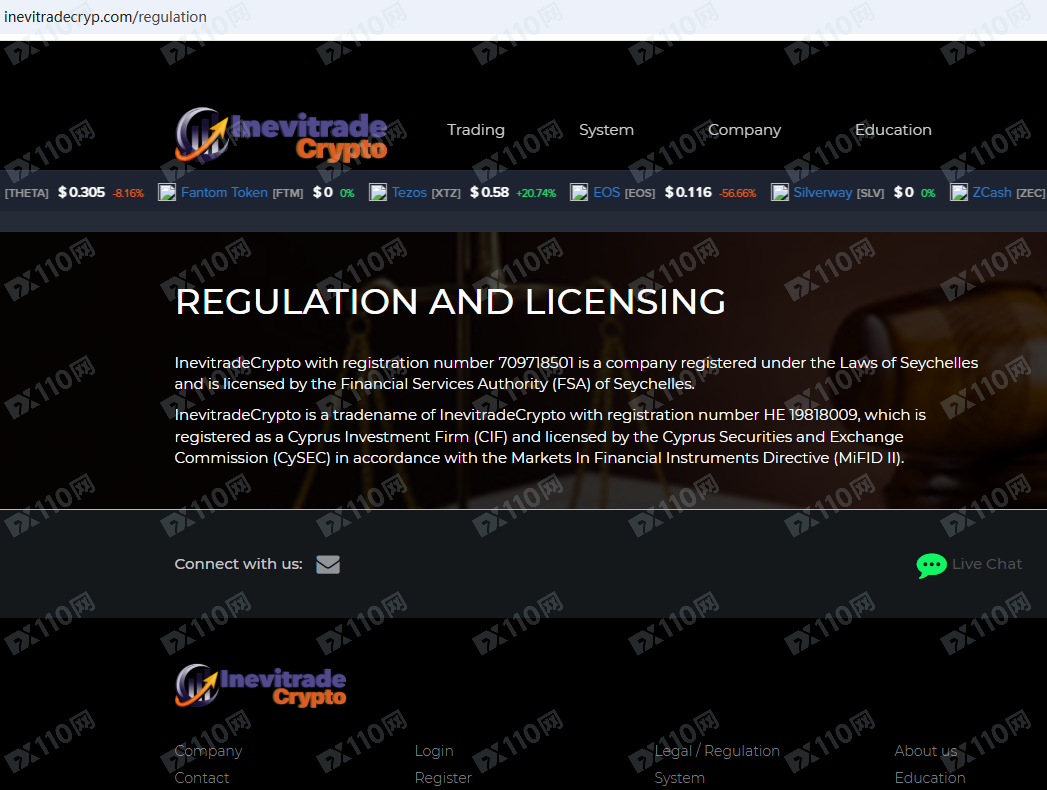 InevitradeCrypto平臺宣傳在塞舌爾和塞浦路斯有注冊公司,并獲得塞舌爾金融服務管理局FSA和塞浦路斯證券交易委員會CySEC的監管,提供外匯、期貨、指數、貴金屬、能源和股票等金融衍生品投資交易服務。