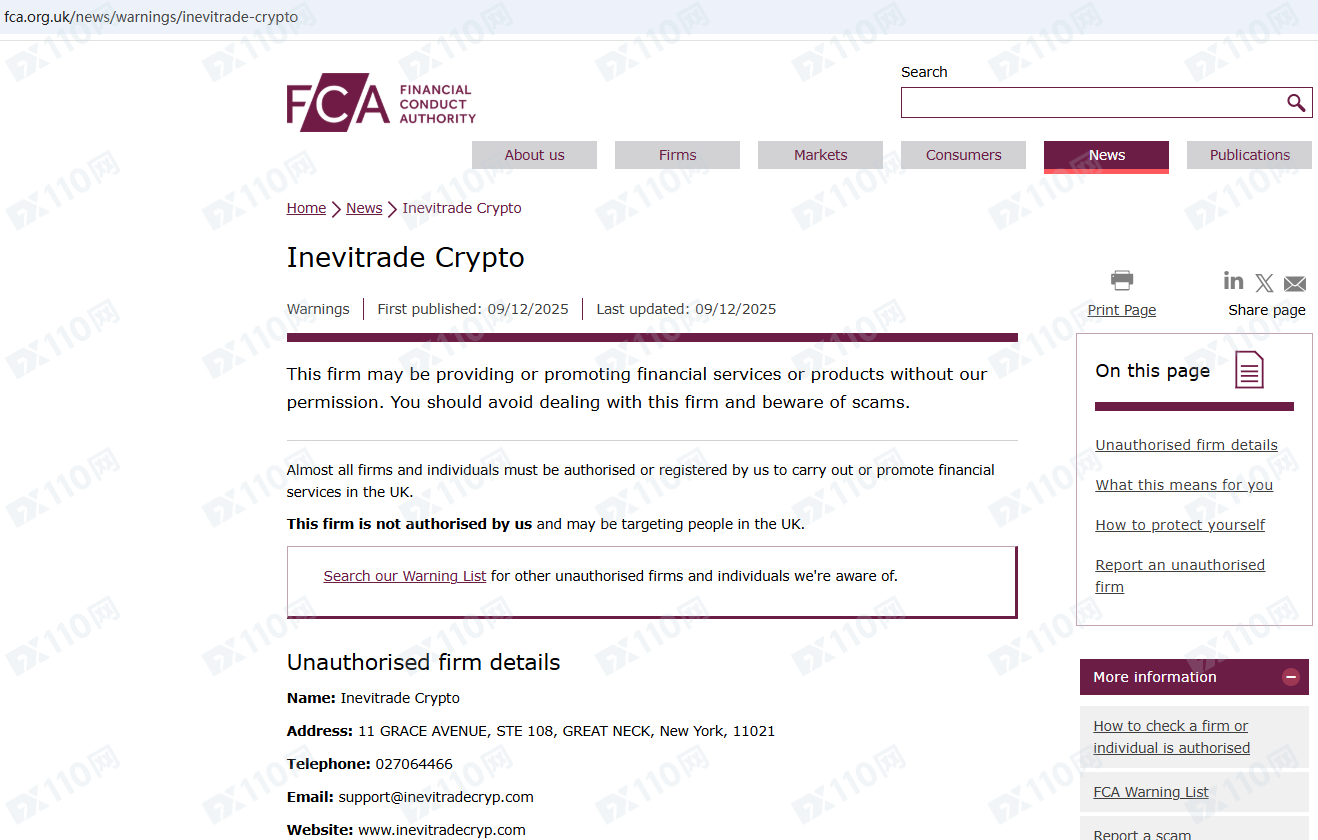因未經授權許可提供金融產品投資服務,InevitradeCrypto已被英國FCA列入警示黑名單,請遠離!