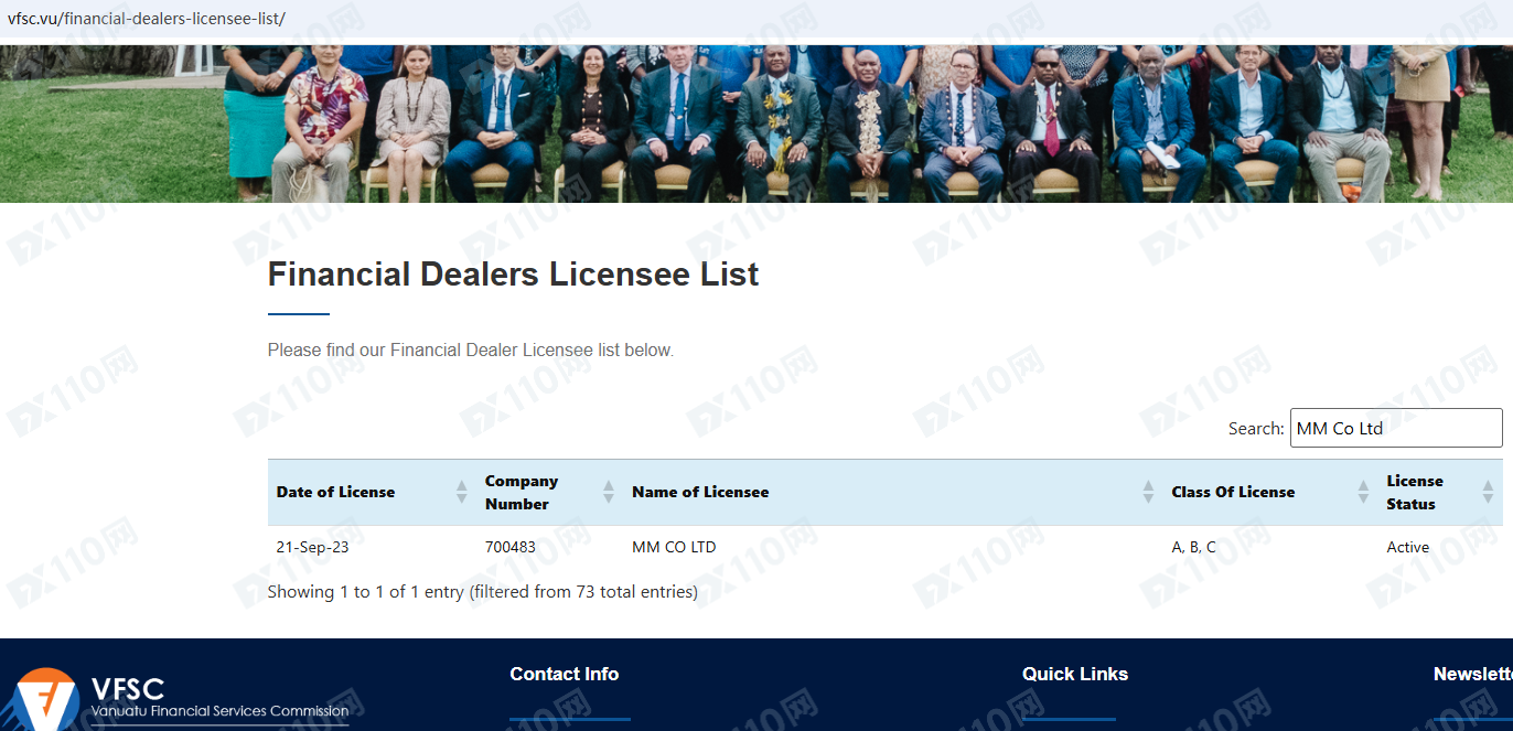 經查詢,在瓦努阿圖金融服務委員會VFSC的經紀商名單中確實有查詢到MM CO LTD,但并未登記網址!
