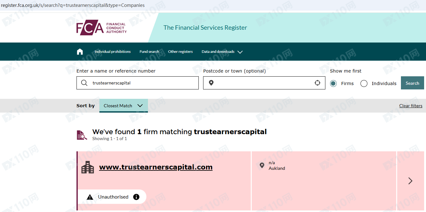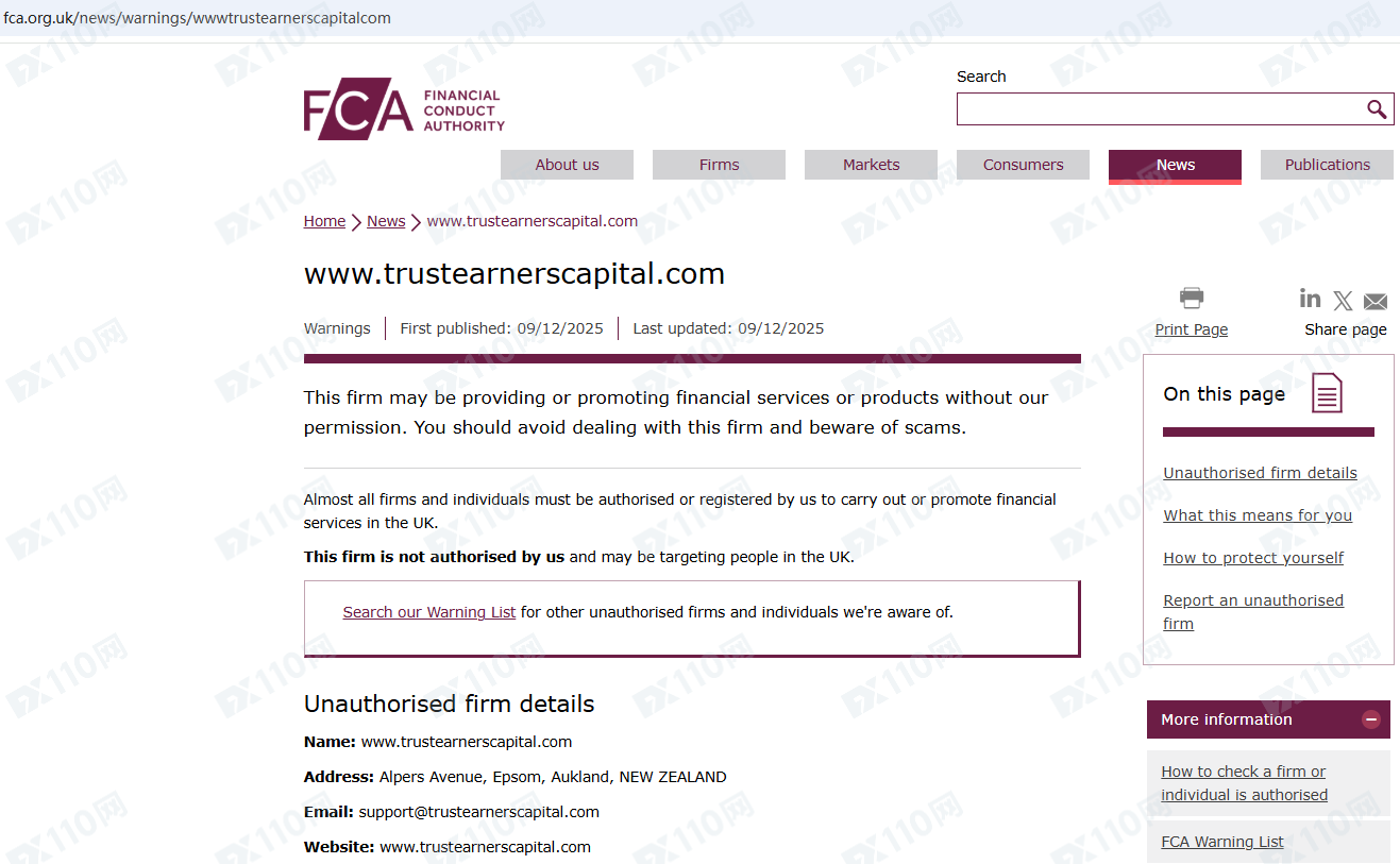 因未經授權許可提供金融產品投資服務,Trust Earners Capital已被英國FCA列入警示黑名單,請遠離!