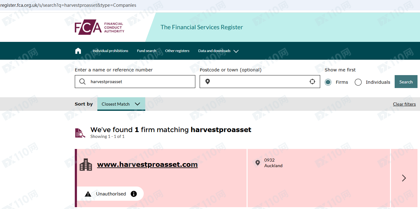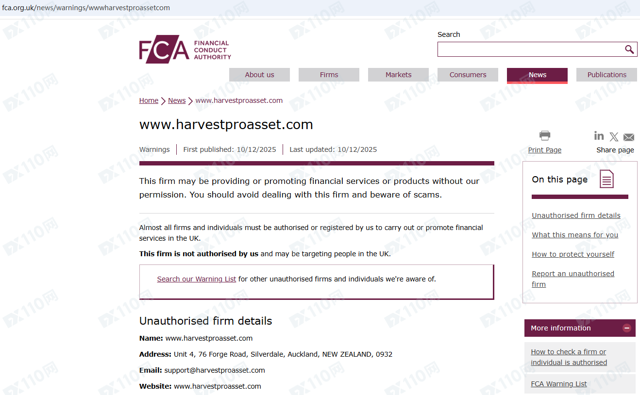 因未經授權許可提供金融產品投資服務,Harvest Pro Asset已被英國FCA列入警示黑名單,請遠離!