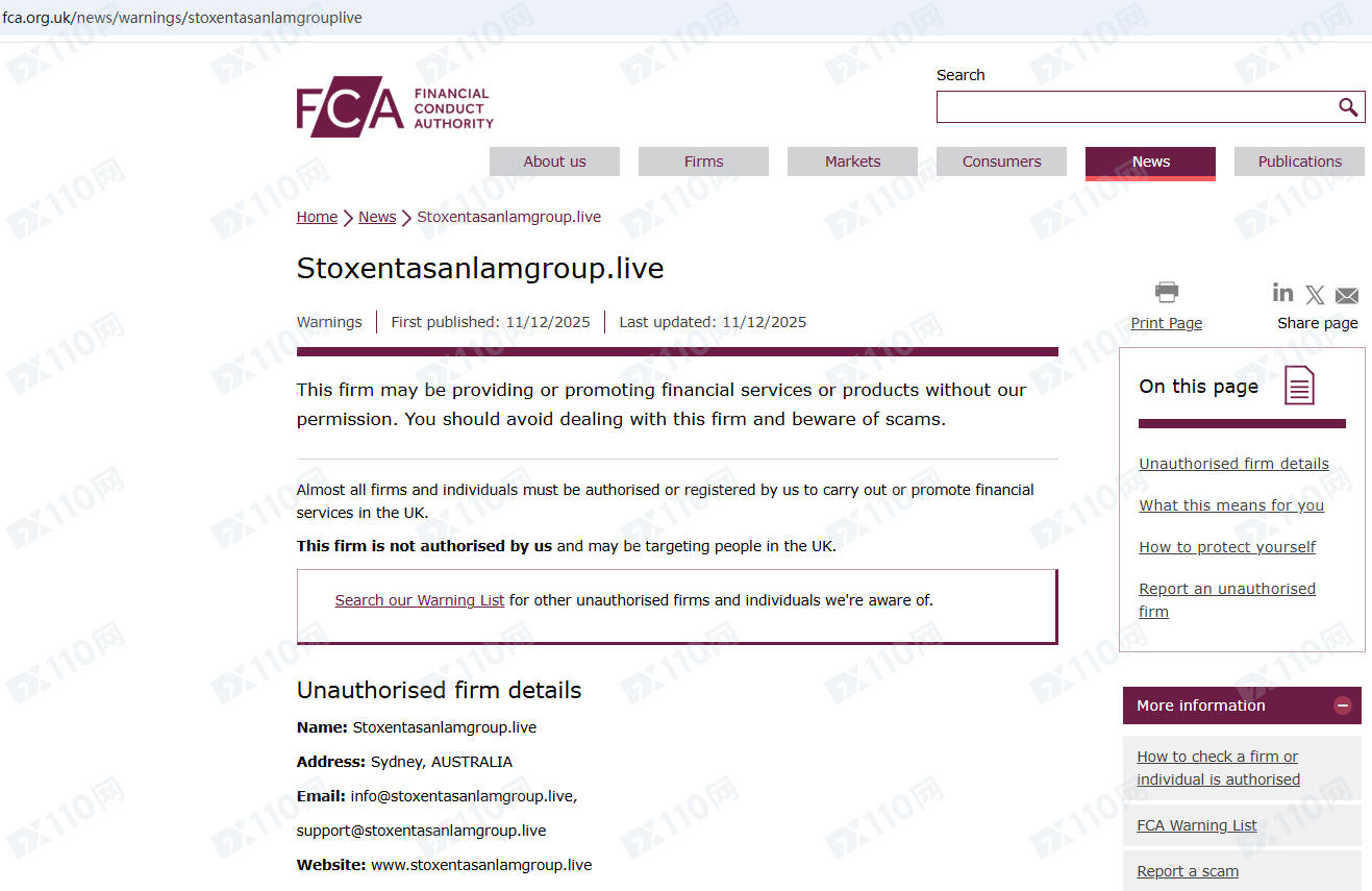 因未經授權許可提供金融產品投資服務,Stoxentasanlamgroup已被英國FCA列入警示黑名單,請遠離!