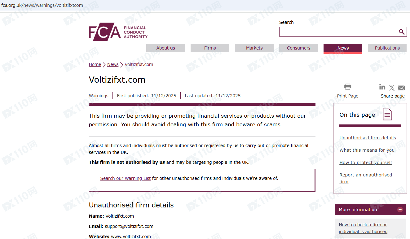 因未經授權許可提供金融產品投資服務,Voltizifxt已被英國FCA列入警示黑名單,請遠離!