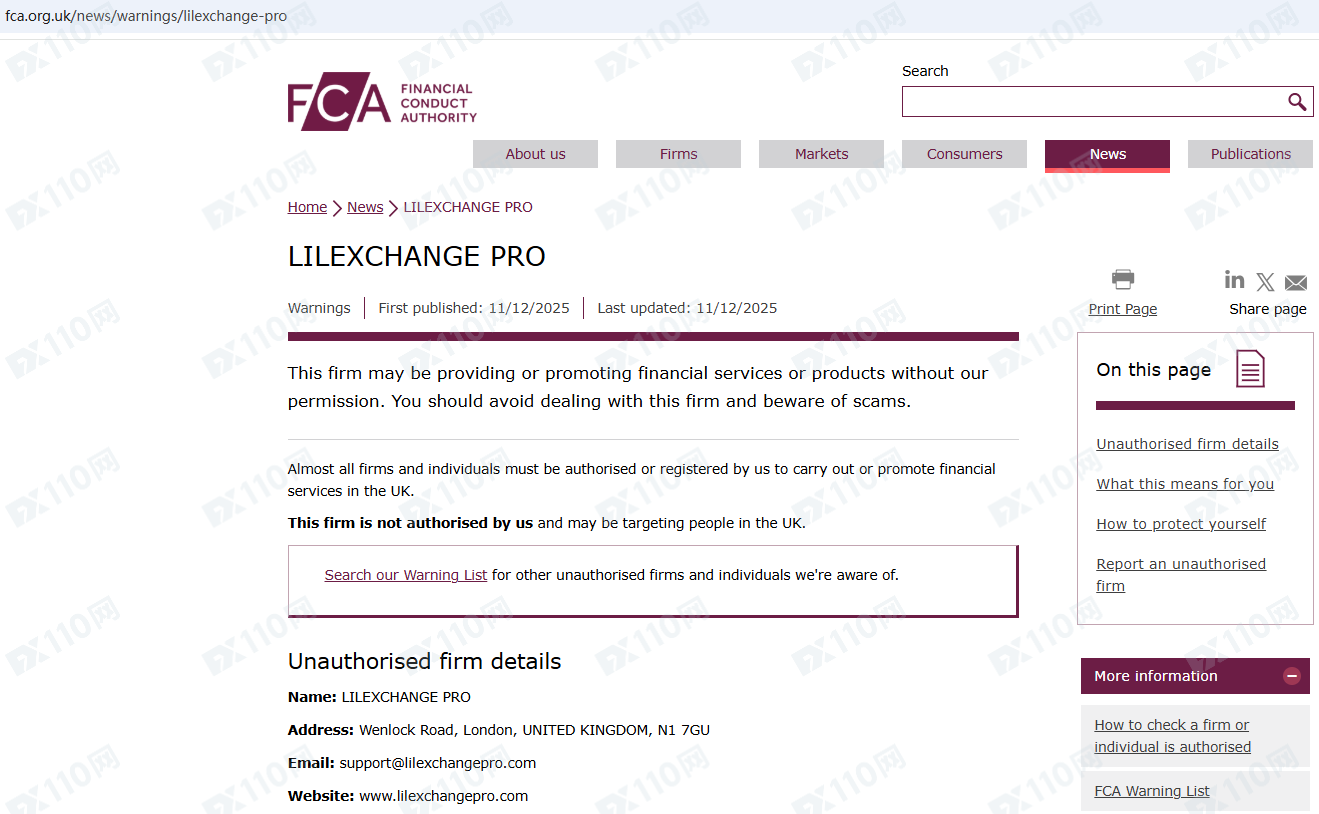 因未經授權許可提供金融產品投資服務,Lilexchangepro已被英國FCA列入警示黑名單,請遠離!