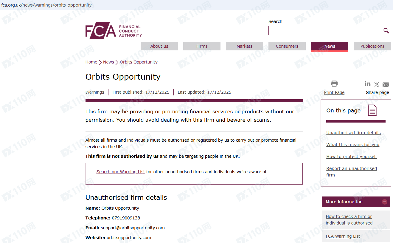 因未經授權許可提供金融產品投資服務,Orbits Opportunity已被英國FCA列入警示黑名單,請遠離!