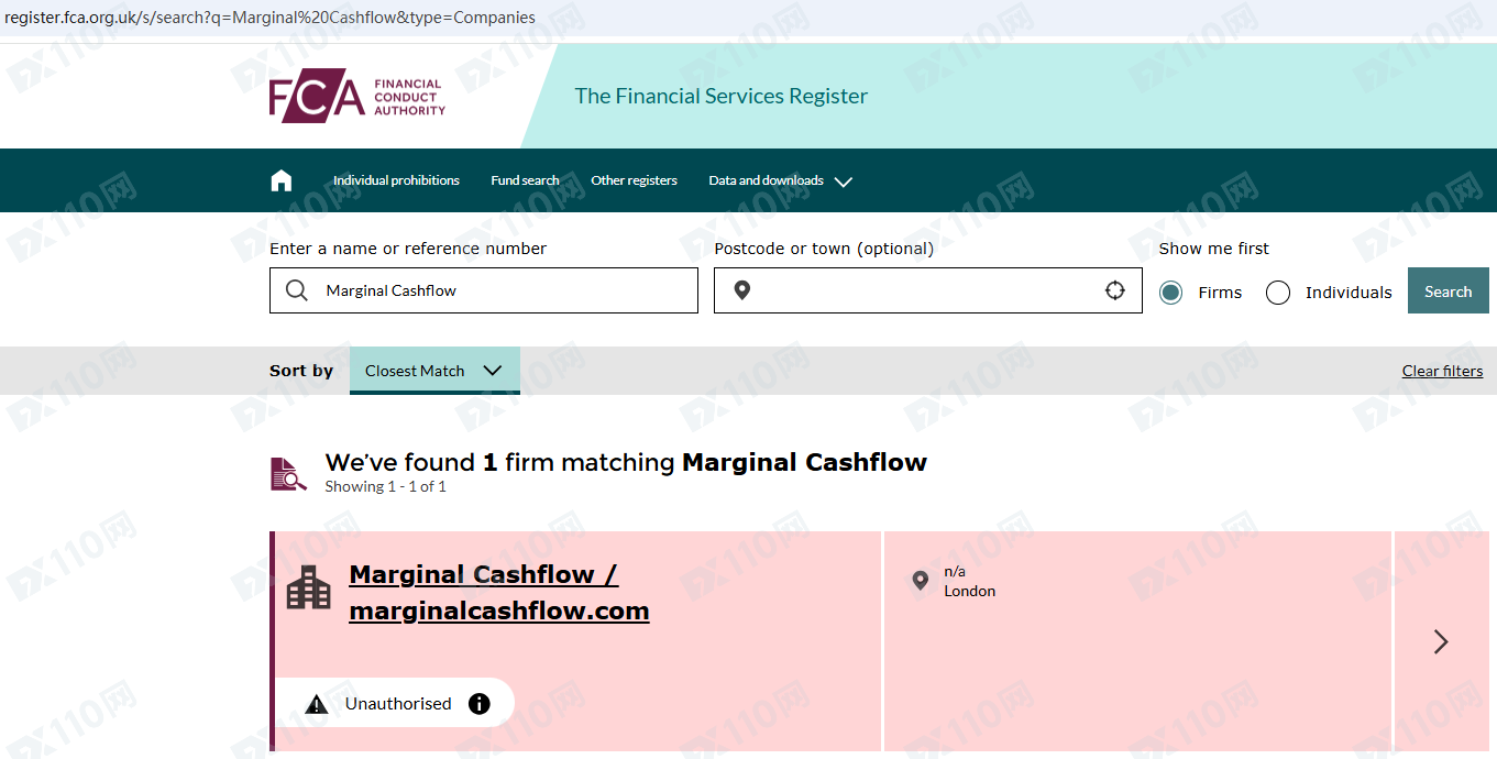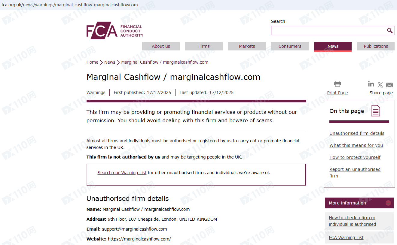 因未經授權許可提供金融產品投資服務,Marginal Cashflow已被英國FCA列入警示黑名單,請遠離!