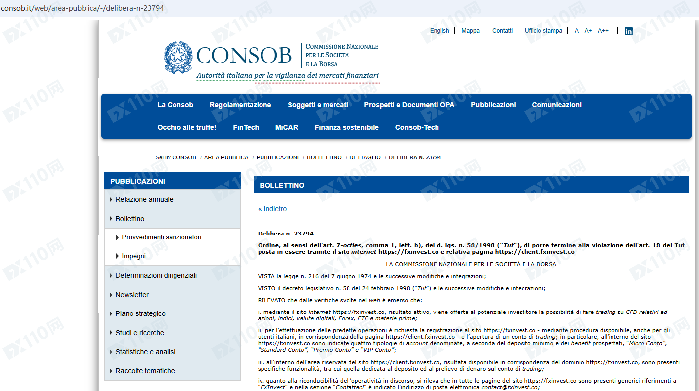 因未經授權許可提供金融產品投資服務,FXinvest已被意大利金融市場監管局CONSOB列入警示黑名單,請遠離!