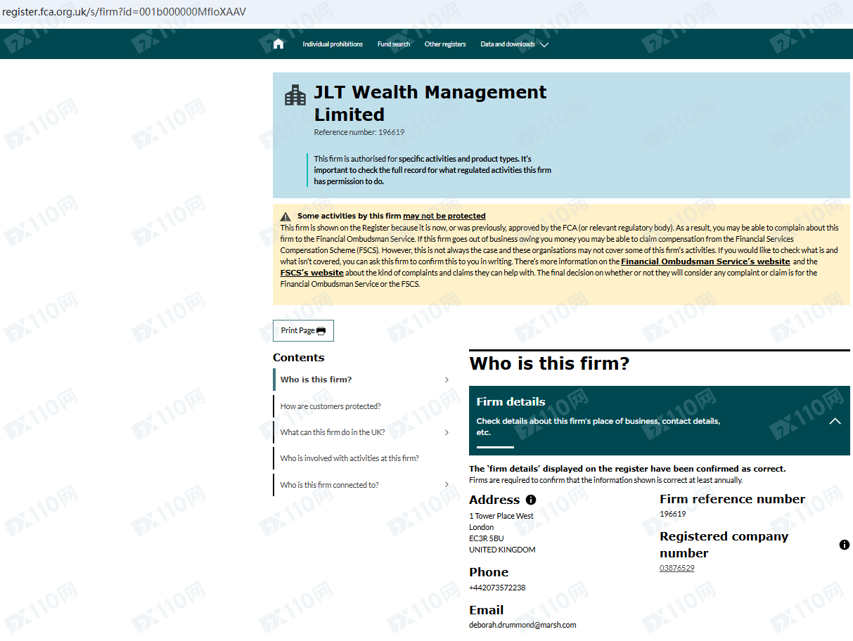 我們在英國FCA確實有查詢到一家JLT Wealth Management Limited,但登記域名為marsh.com,是一家咨詢顧問公司,非金融經紀商,顯然該平臺是冒充套牌。
