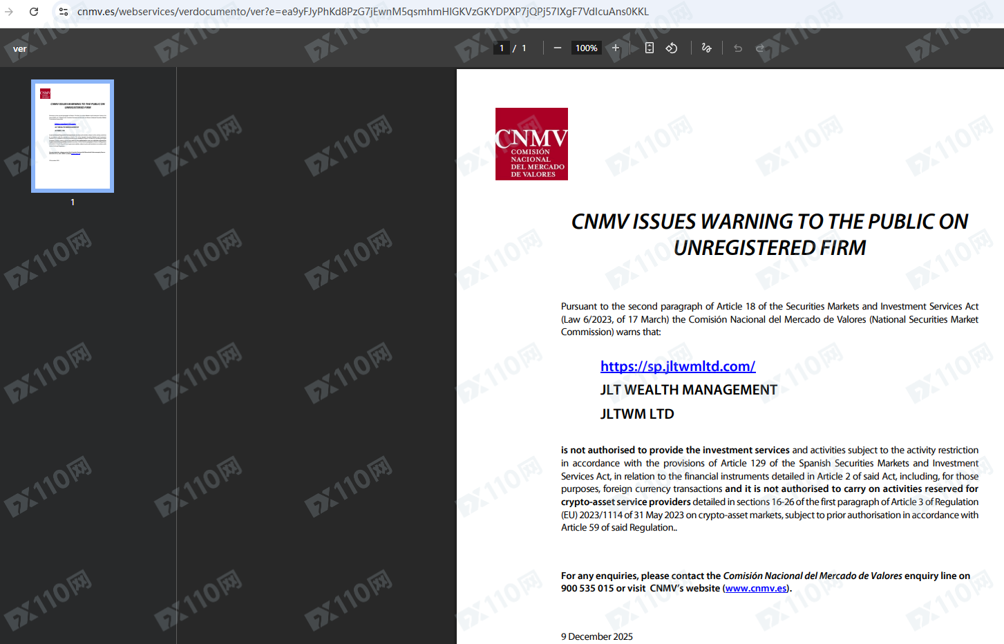 因未經授權許可提供金融產品投資服務,JLT Wealth Management已被西班牙國家證券市場委員會CNMV列入警示黑名單,請遠離!