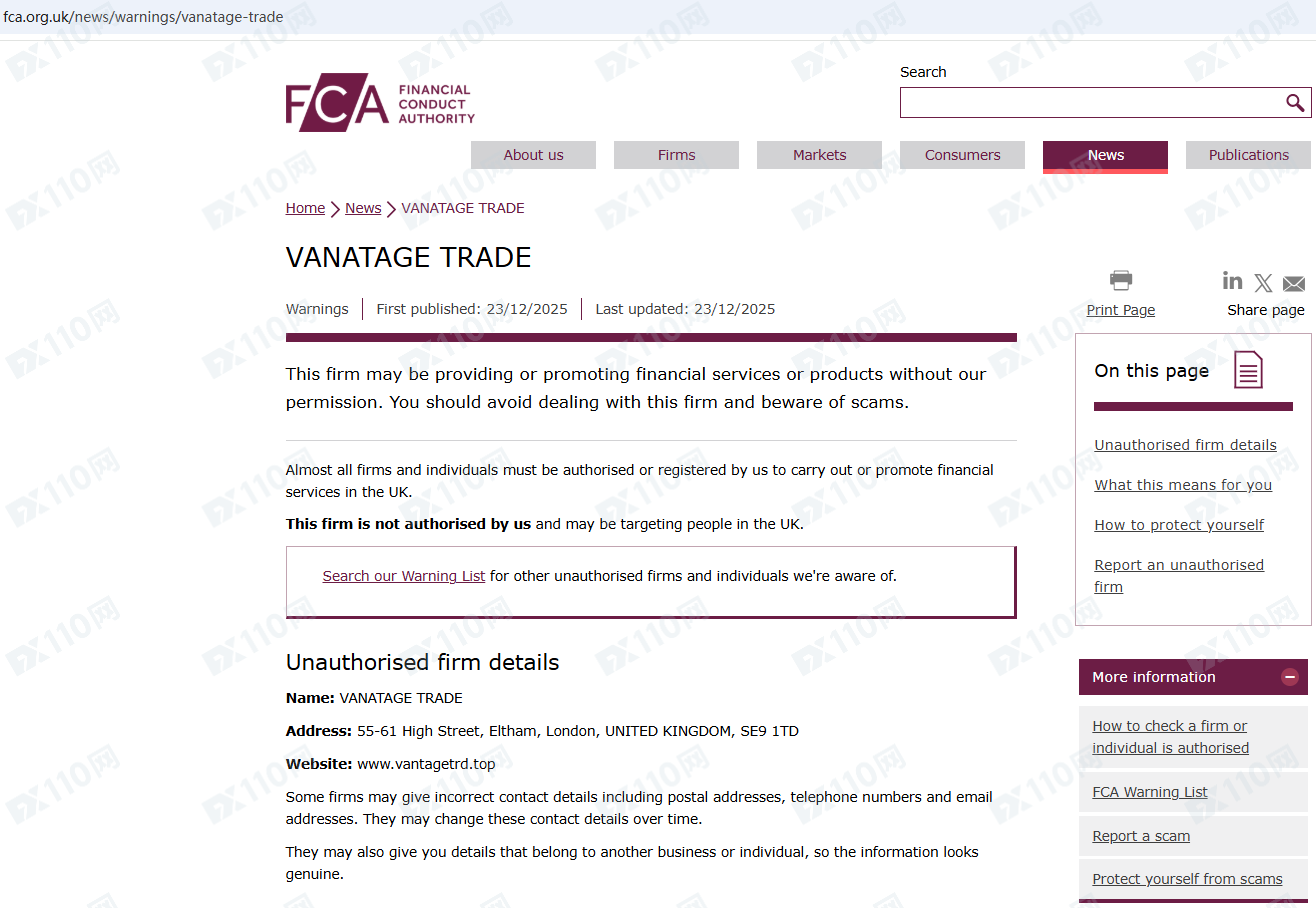 因未經授權許可提供金融產品投資服務,Vantage Trade已被英國FCA列入警示黑名單,請遠離!