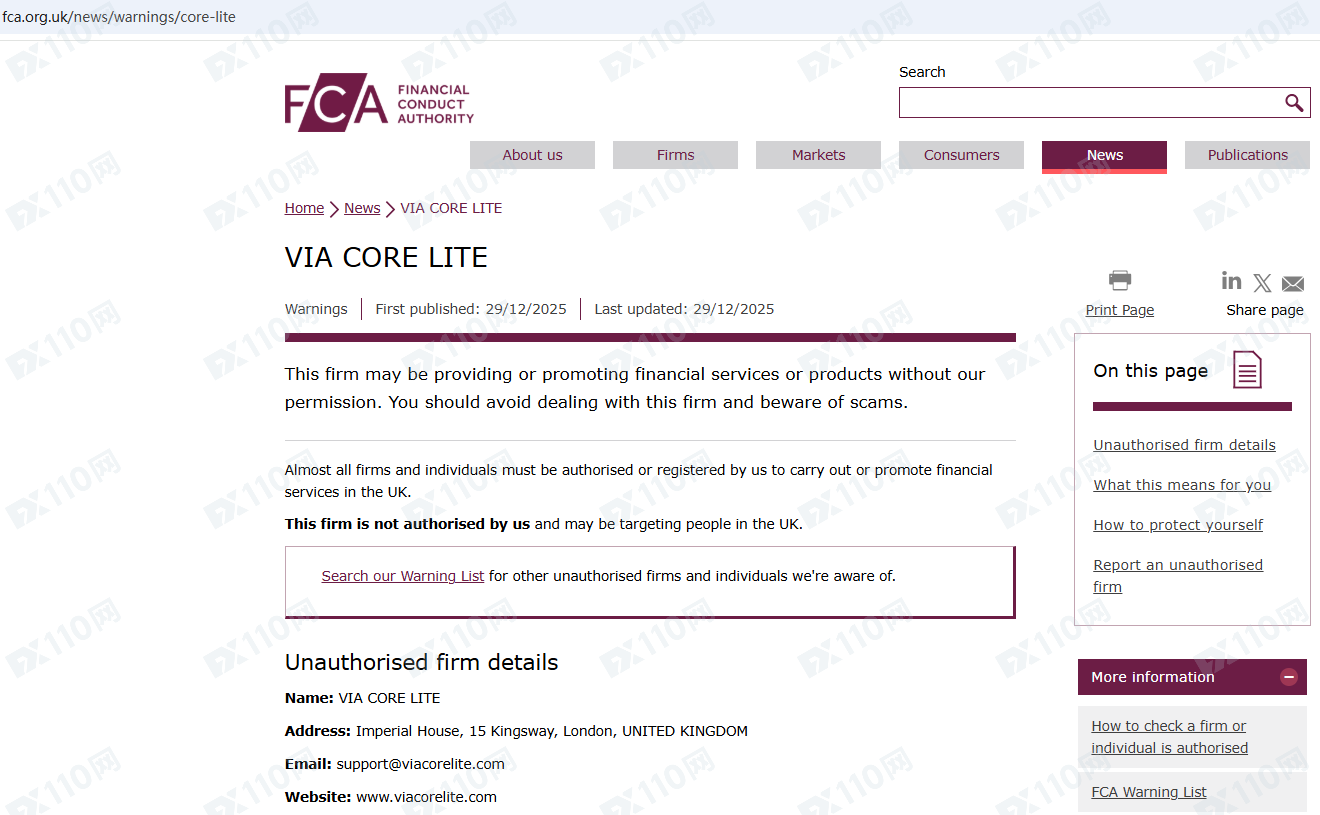 因未經授權許可提供金融產品投資服務,Viacorelite已被英國FCA列入警示黑名單,請遠離!