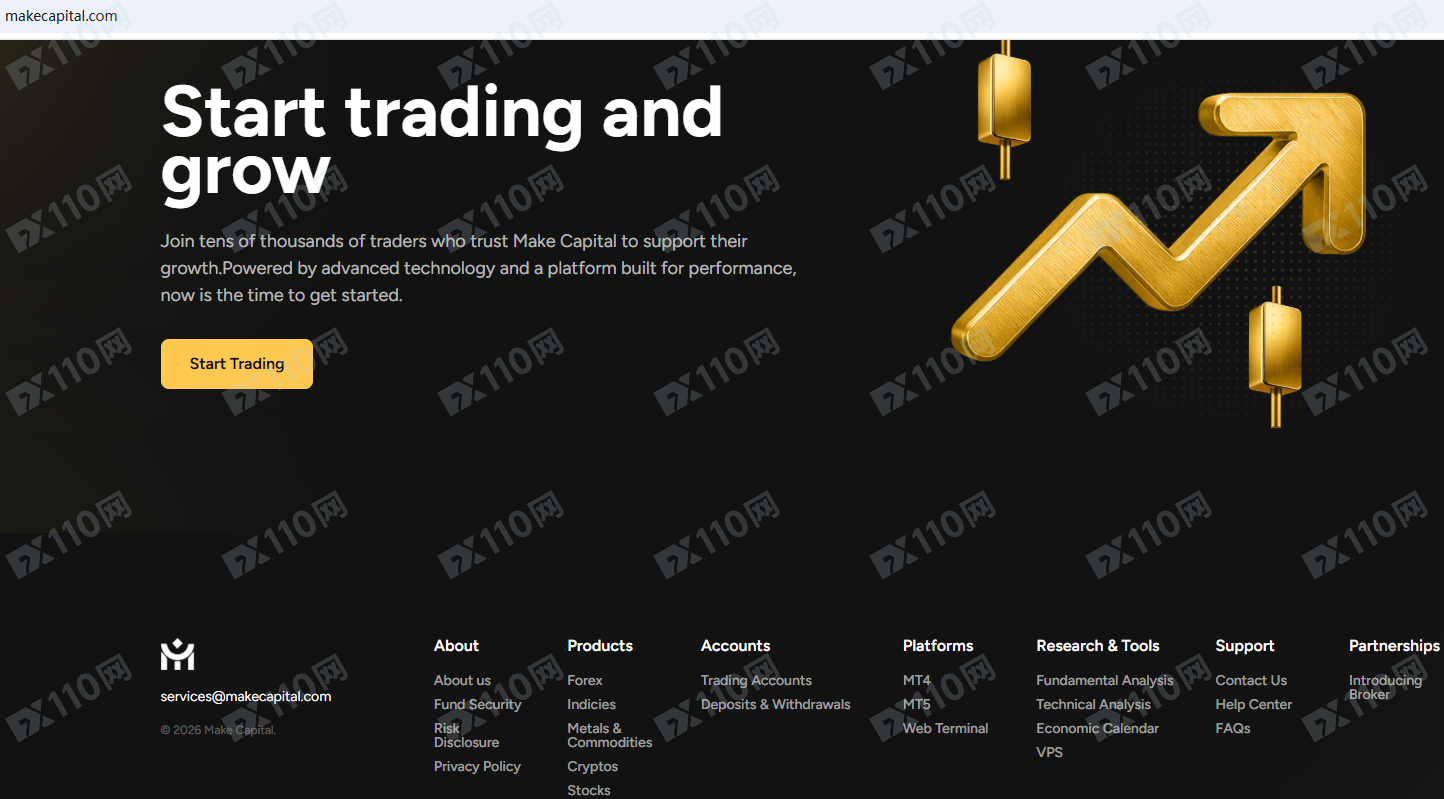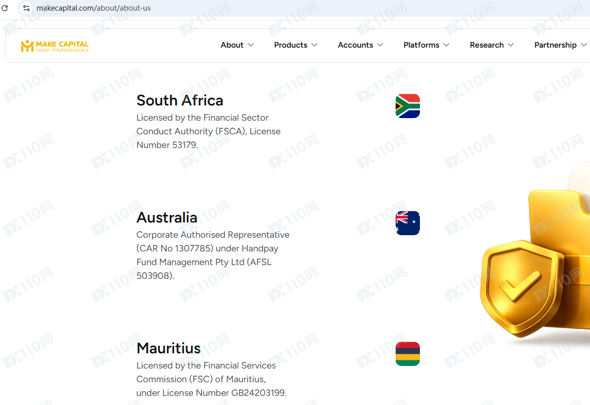 Make Capital平臺宣傳獲得南非FSCA(監管號:53179)、澳大利亞ASIC和毛里求斯FSC的許可和監管,提供外匯、指數、貴金屬、大宗商品、加密貨幣、股票等金融衍生品投資交易服務。