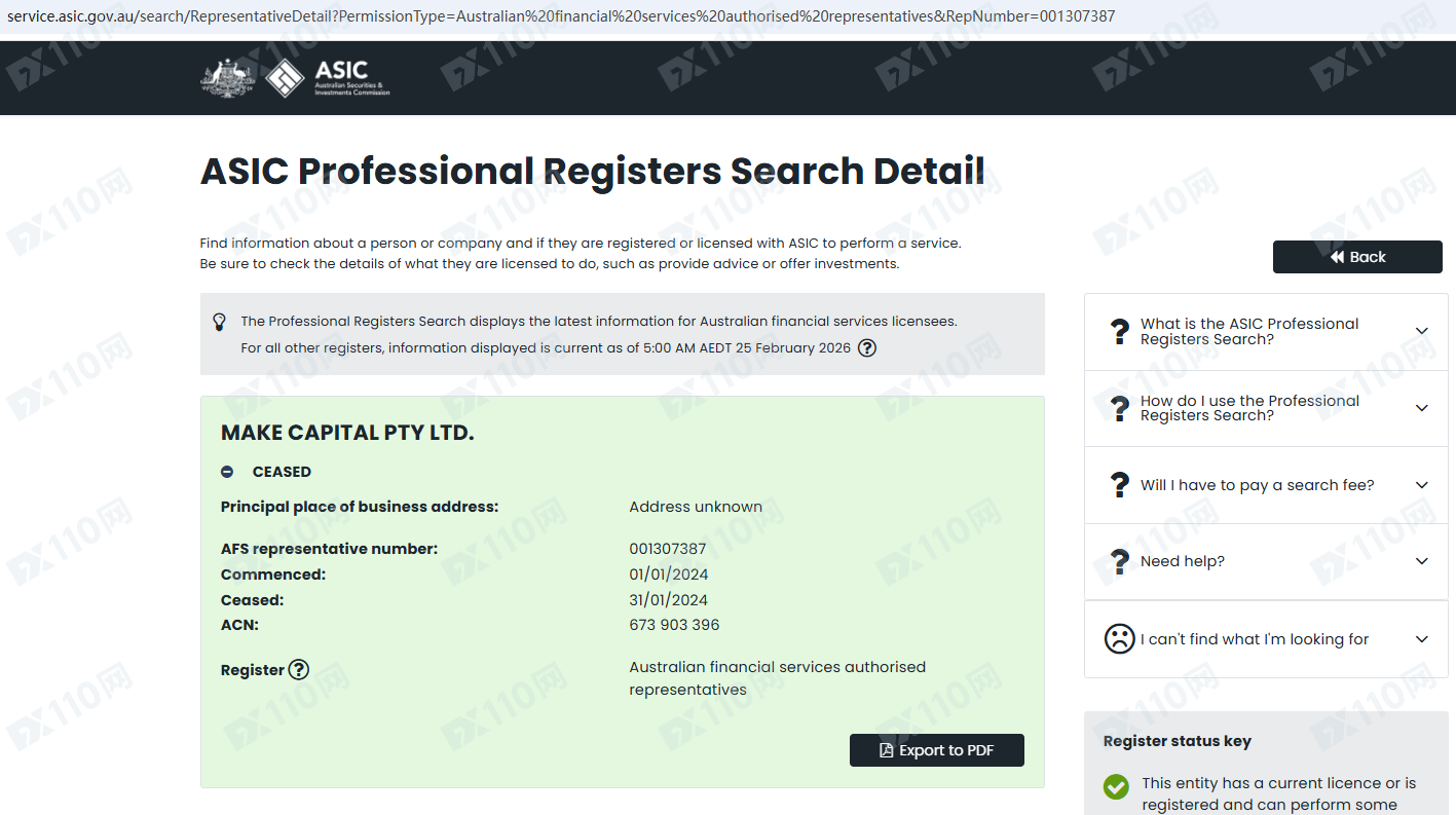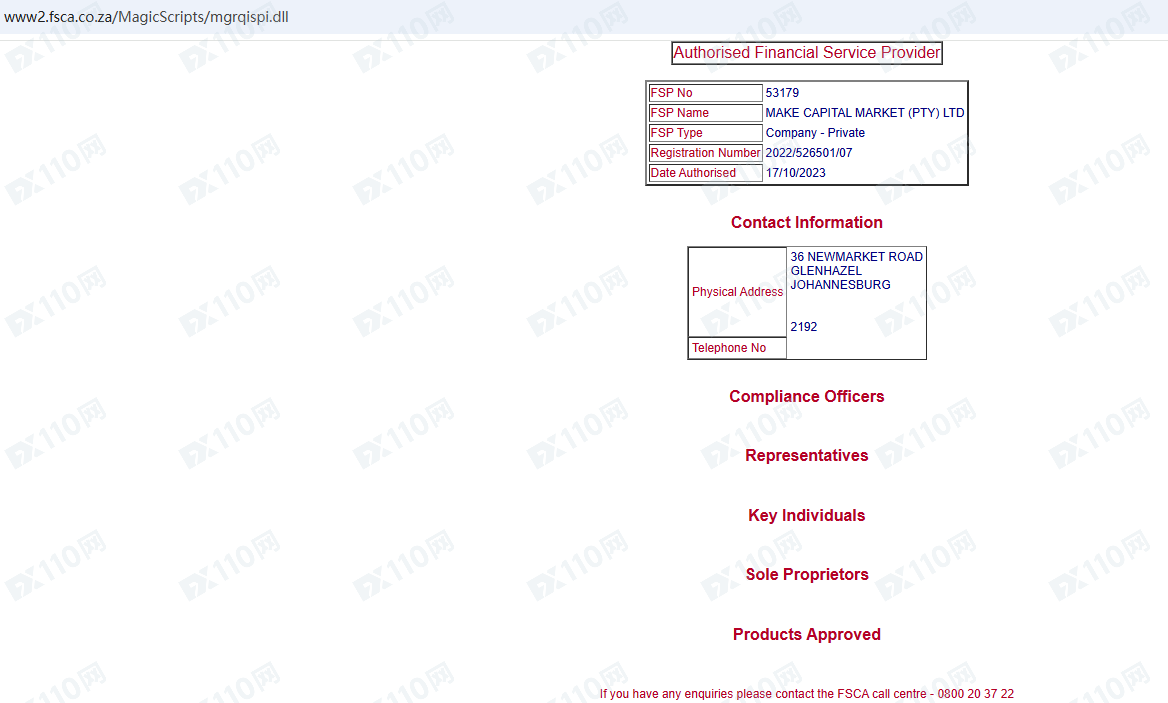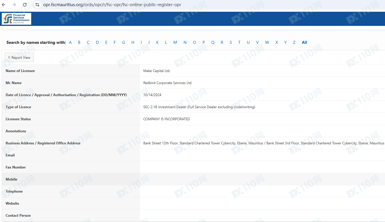 經查詢,南非FSCA 53179對應公司名稱為MAKE CAPITAL MARKET (PTY) LTD,未登記網址。澳大利亞ASIC有查詢到MAKE CAPITAL PTY LTD,登記為AR授權代表,但早已在2024年注銷!毛里求斯FSC有一家Make Capital Ltd,但并未登記網址,請謹慎!