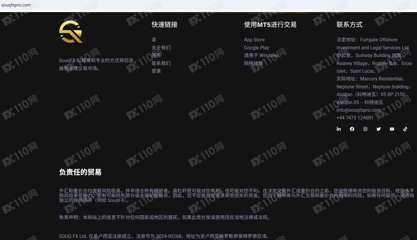 SouqFX平臺宣傳所屬SOUQ FX Ltd,在圣盧西亞注冊成立,注冊號為2024-00268,提供外匯、加密貨幣、大宗商品等等金融衍生品投資交易服務。