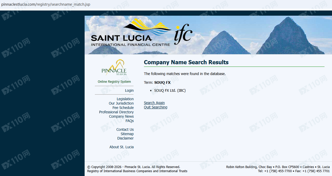 經查詢,我們在圣盧西亞國際金融中心IFC有查詢到SOUQ FX Ltd的登記,但請注意,圣盧西亞國際金融中心IFC僅是國際商業公司注冊處,不提供金融衍生品經紀服務的授權許可。