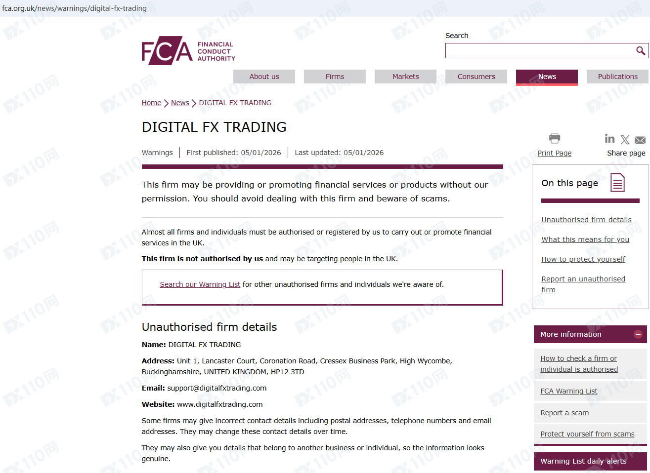 因未經授權許可提供金融產品投資服務,Digital FX Trading已被英國FCA列入警示黑名單,請遠離!