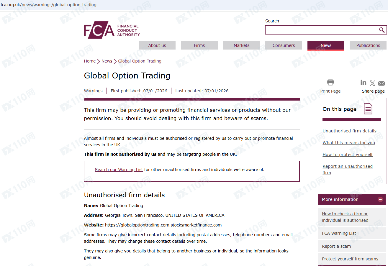 因未經授權許可提供金融產品投資服務,Global Option Trading已被英國FCA列入警示黑名單,請遠離!