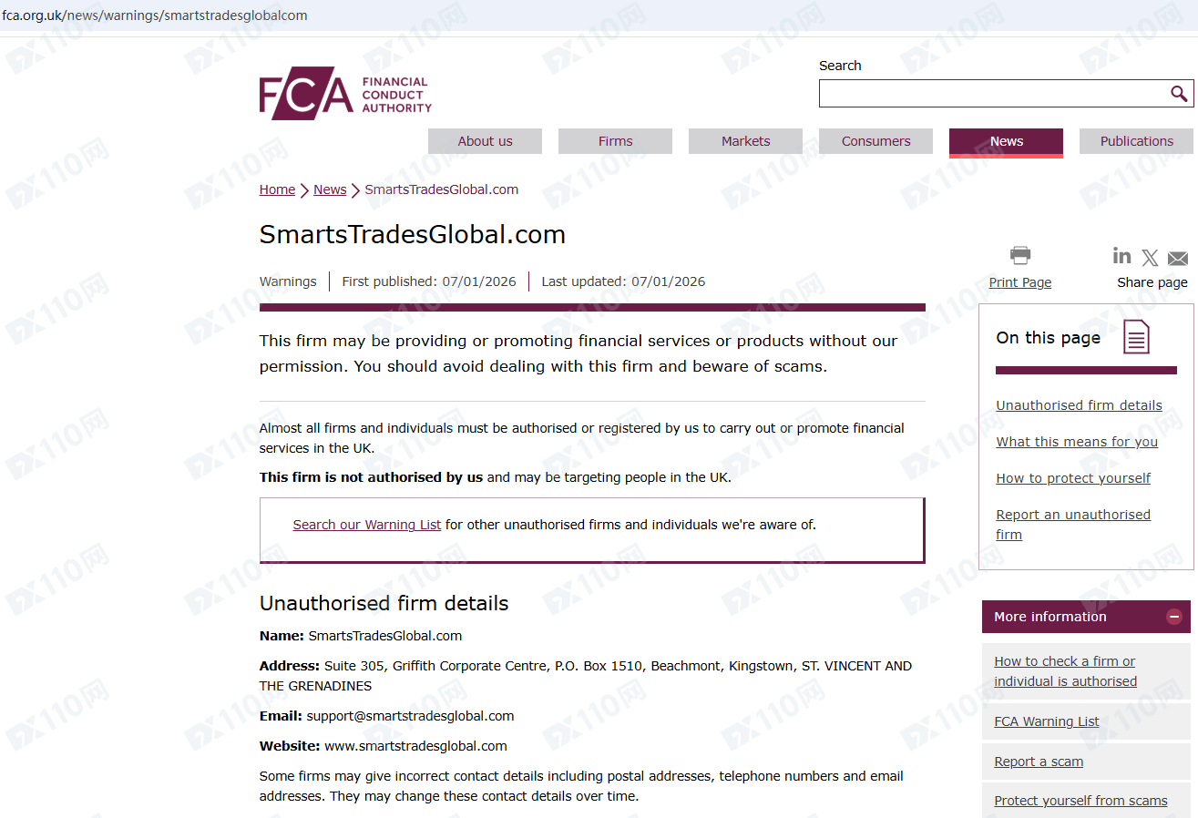 因未經授權許可提供金融產品投資服務,Smart Trades Global已被英國FCA列入警示黑名單,請遠離!
