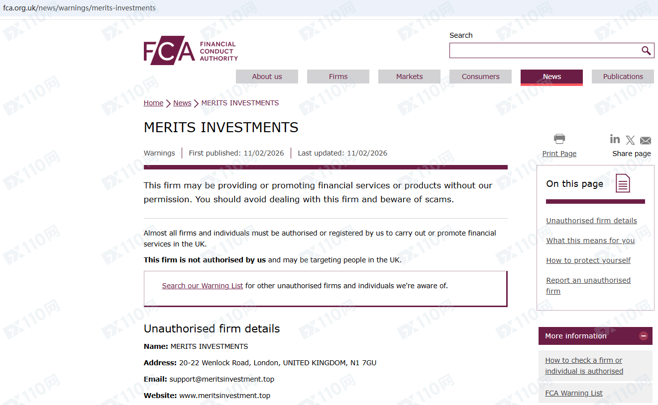 因未經授權許可提供金融產品投資服務,Merits Investment已被英國FCA列入警示黑名單,請遠離!