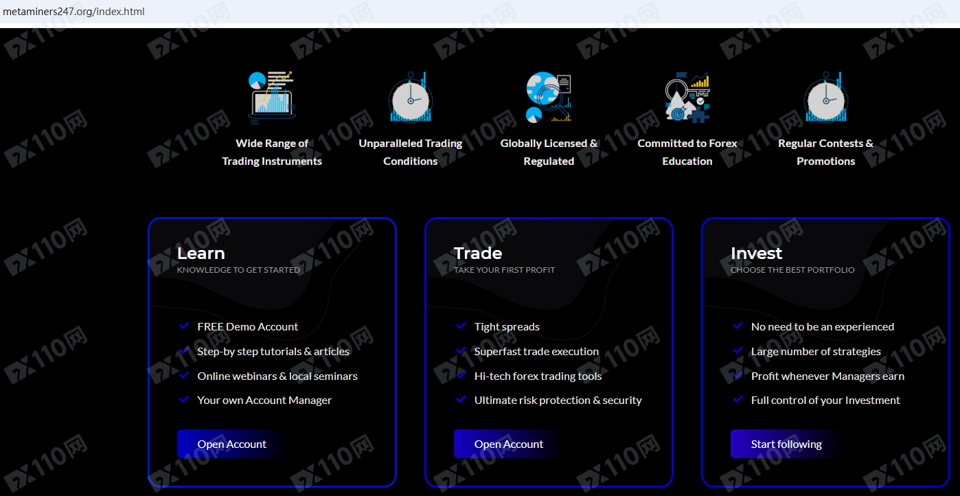 MetaMiners247平臺宣傳位于美國,獲得全球許可和監管,提供外匯、加密貨幣、指數、股票、能源、大宗商品等金融衍生品投資交易服務。