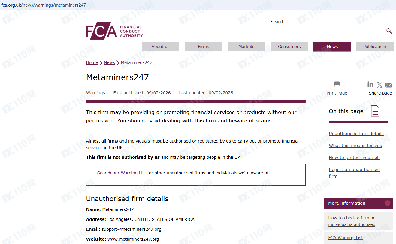 因未經授權許可提供金融產品投資服務,MetaMiners247已被英國FCA列入警示黑名單,請遠離!