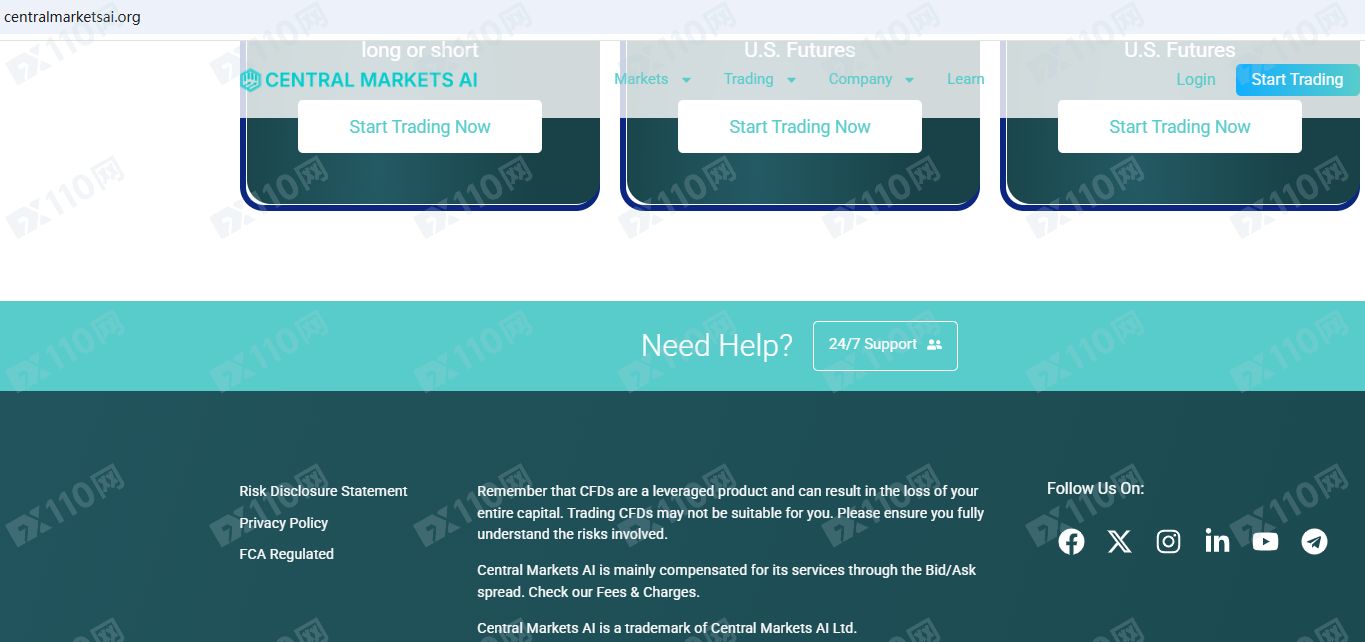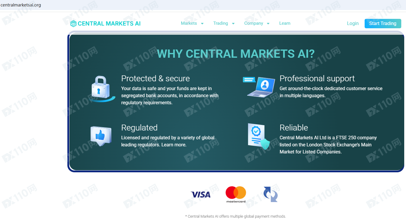 Central Markets AI平臺宣傳受英國FCA的監管,提供加密貨幣、指數、外匯、大宗商品、股票等金融衍生品投資交易服務。
