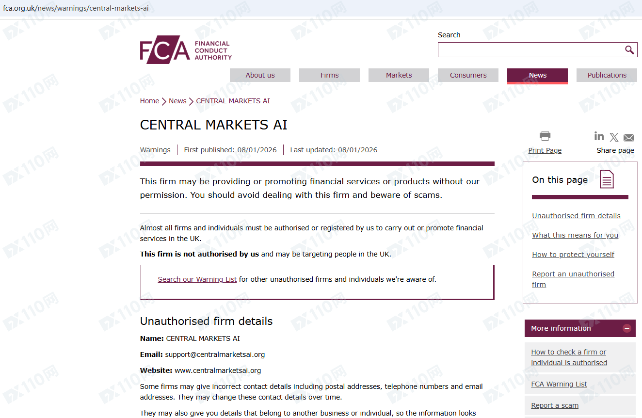 因未經授權許可提供金融產品投資服務,Central Markets AI已被英國FCA列入警示黑名單,請遠離!