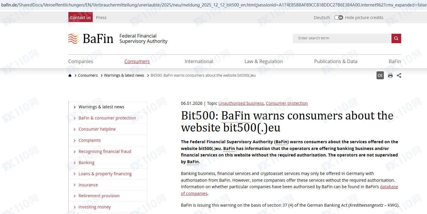 因未經授權許可提供金融產品投資服務,Bit500已被德國BaFin列入警示黑名單,請遠離!