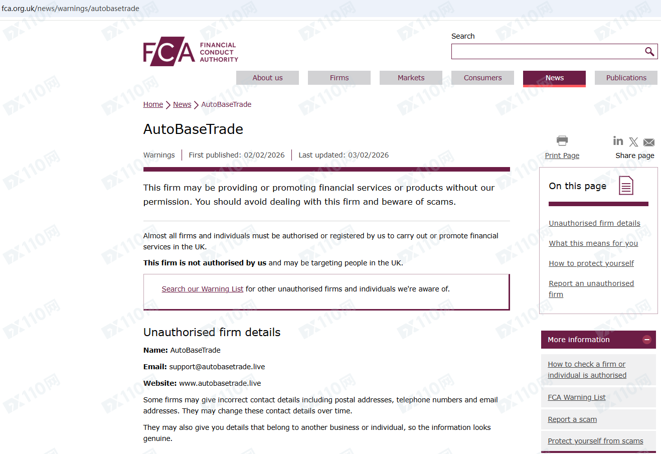 經查詢,AutoBaseTrade平臺因未經授權許可提供金融產品投資服務,已被英國FCA列入警示黑名單,請遠離!
