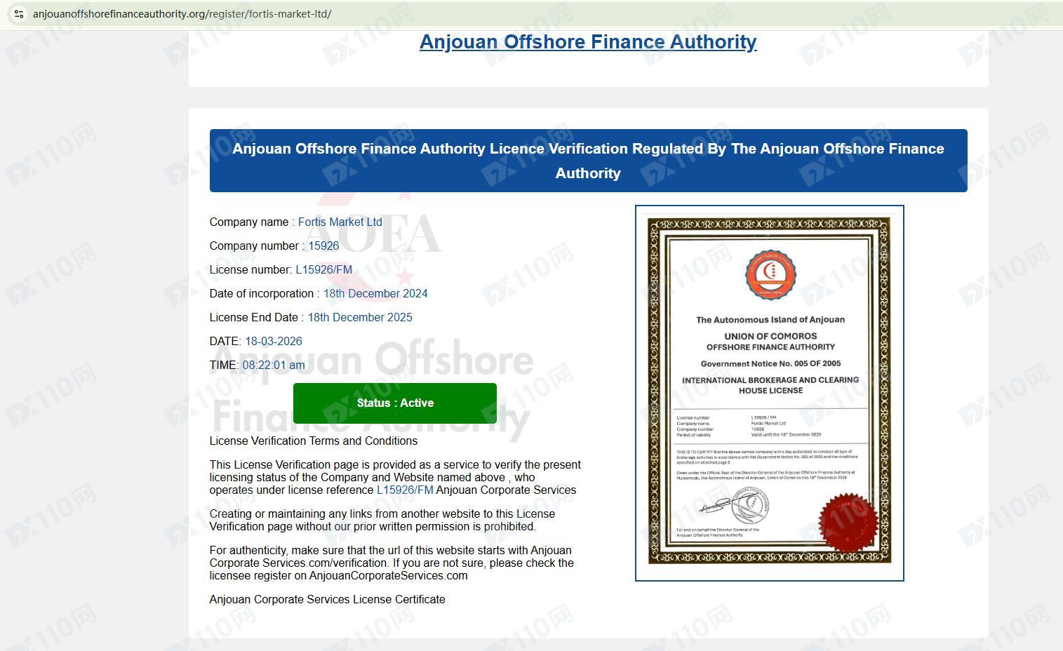 經查詢,在昂儒昂離岸金融管理局(AOFA)的公司列表中有查詢到相關公司名結果,但并未登記網址!