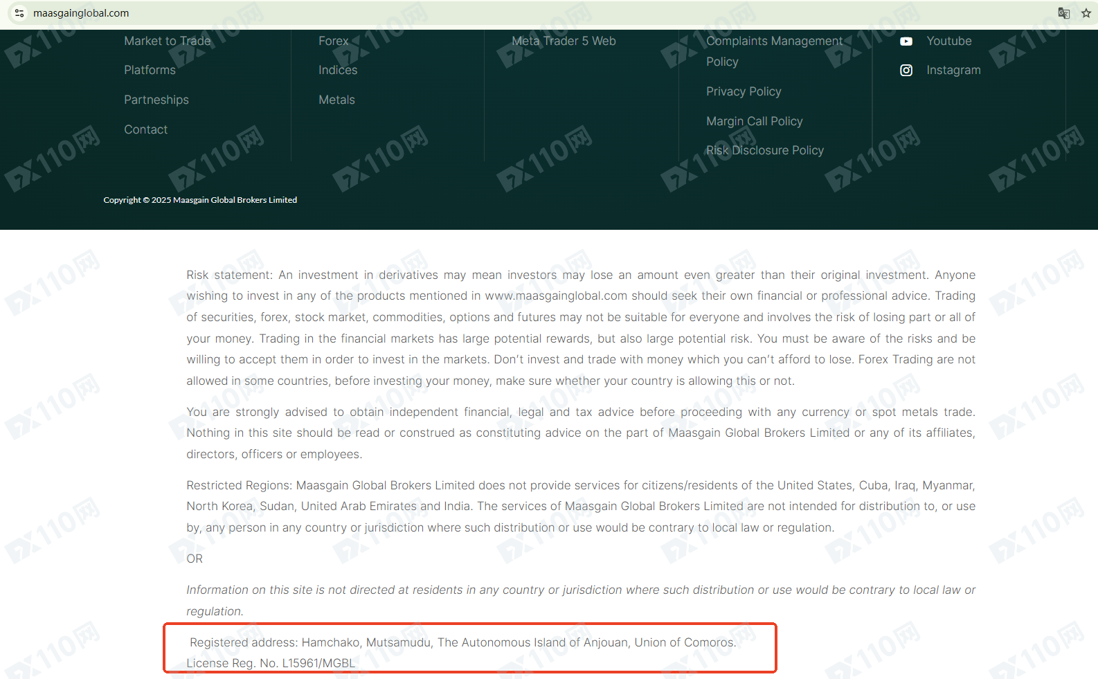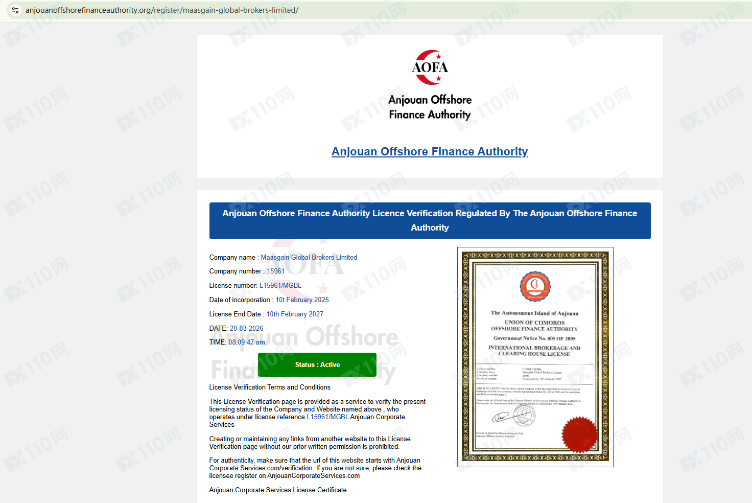 經查詢,在昂儒昂離岸金融管理局(AOFA)的公司列表中有查詢到公司名Maasgain Global Brokers,但并未登記網址!