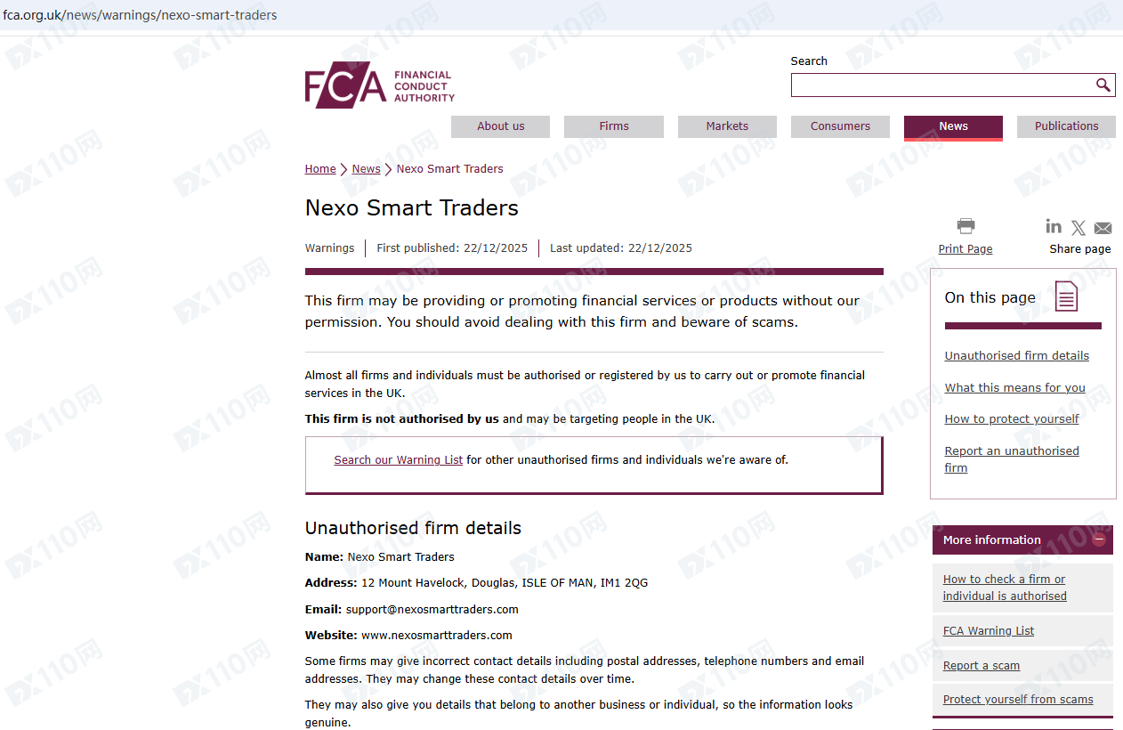 因未經授權許可提供金融產品投資服務,Nexo Smart Traders已被英國FCA列入警示黑名單,請遠離!