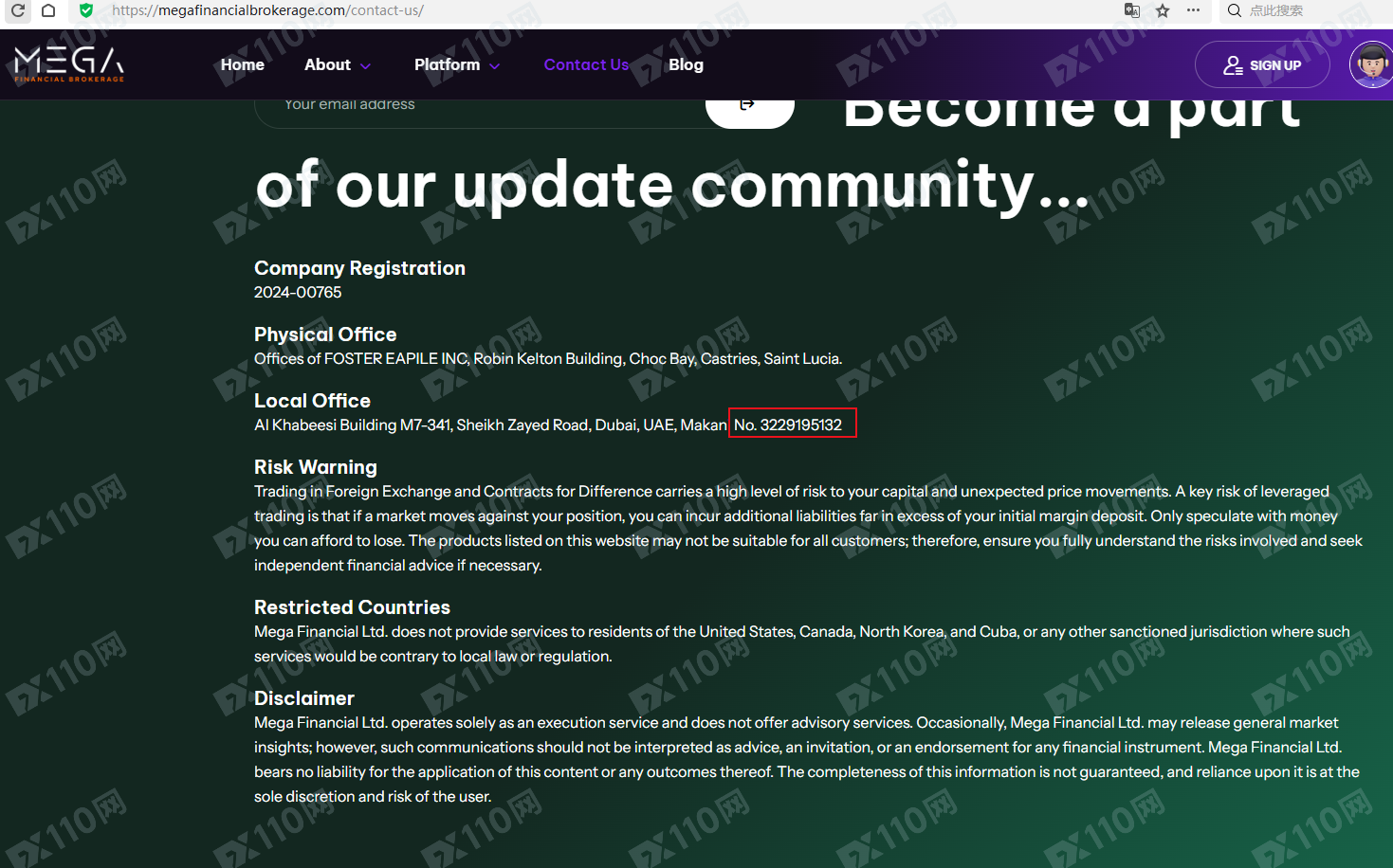 該平臺宣傳提供外匯CFD等金融衍生品投資交易服務,僅在網頁底部表明公司地址位于圣盧西亞,并未公示或提及任何持牌信息。請注意,一般持有有效監管牌照的交易商會在官網內公示此信息以供用戶核查。
