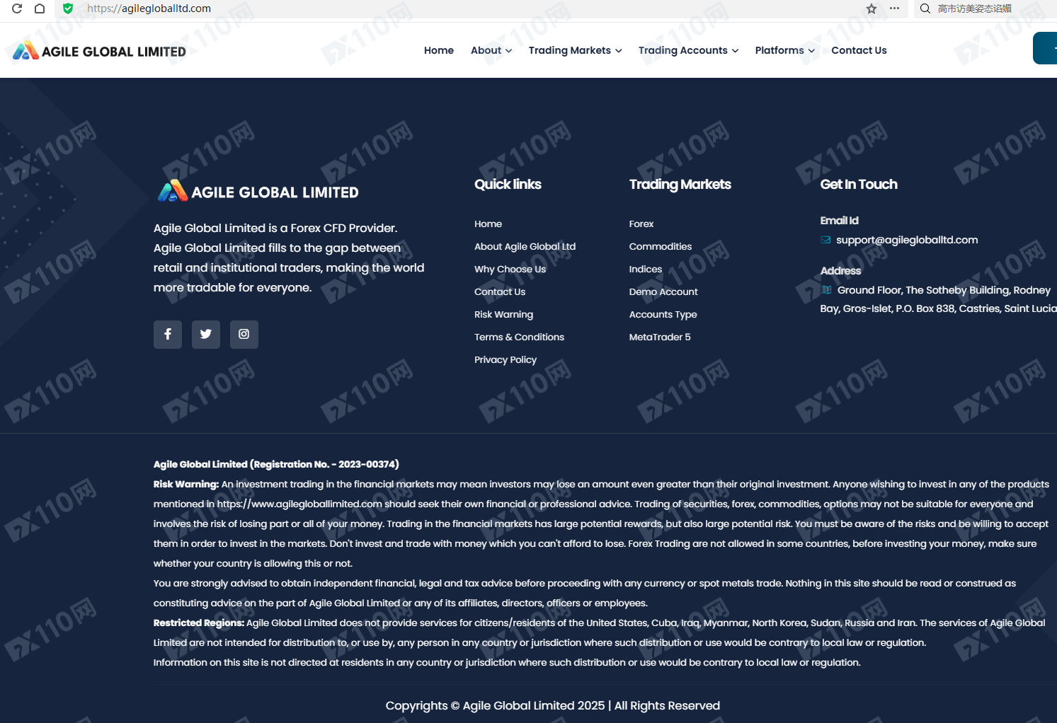 該平臺宣傳提供外匯CFD等金融衍生品投資交易服務,僅在網頁底部表明公司地址位于圣盧西亞,并未公示或提及任何持牌信息。請注意,一般持有有效監管牌照的交易商會在官網內公示此信息以供用戶核查。