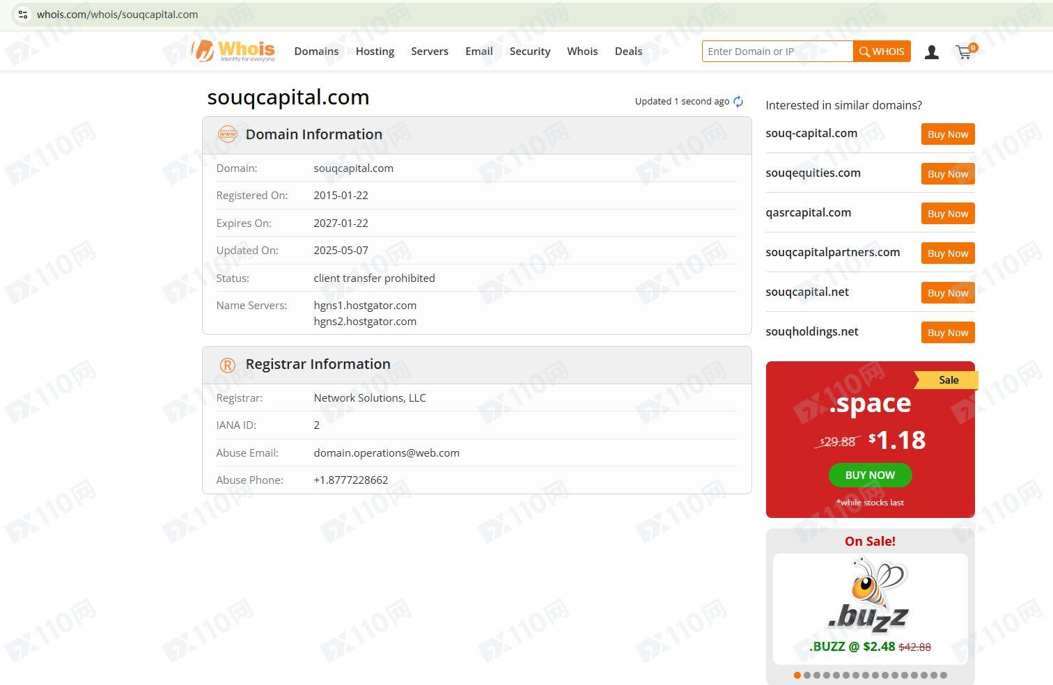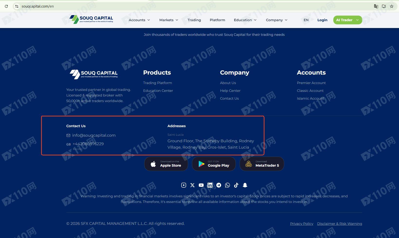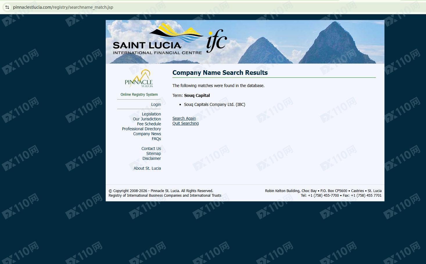 經查詢,我們在圣盧西亞國際金融中心IFC有查詢到一家名為Souq Capitals Company Ltd.的公司登記,但請注意,圣盧西亞國際金融中心IFC僅是國際商業公司注冊處,不提供金融衍生品經紀服務的授權許可,顯然該平臺并未持有任何監管。