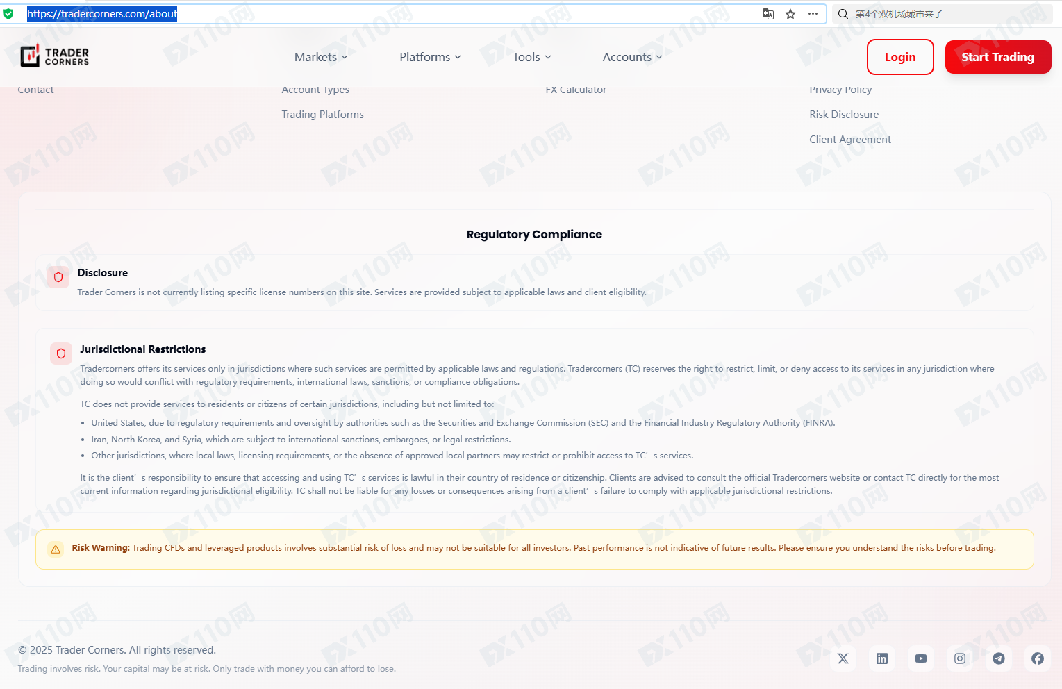 該平臺宣傳提供外匯CFD等金融衍生品投資交易服務,在網頁底部并未公示或提及任何持牌信息。請注意,一般持有有效監管牌照的交易商會在官網內公示此信息以供用戶核查。
