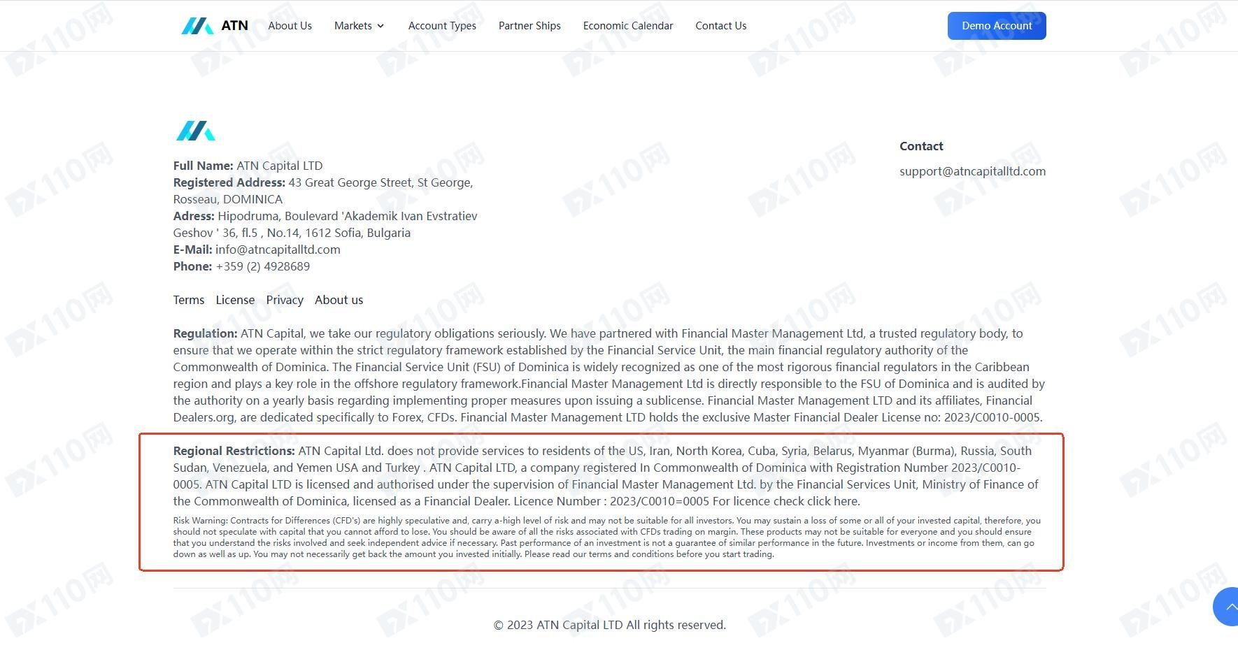 ATN Capital平臺宣傳是由ATN Capital Ltd. 運營,提供外匯、指數、大宗商品等金融衍生品投資交易服務,經多米尼克聯邦財政部金融服務部門許可和授權,并在 Financial Master Management Ltd. 的監督下運營。