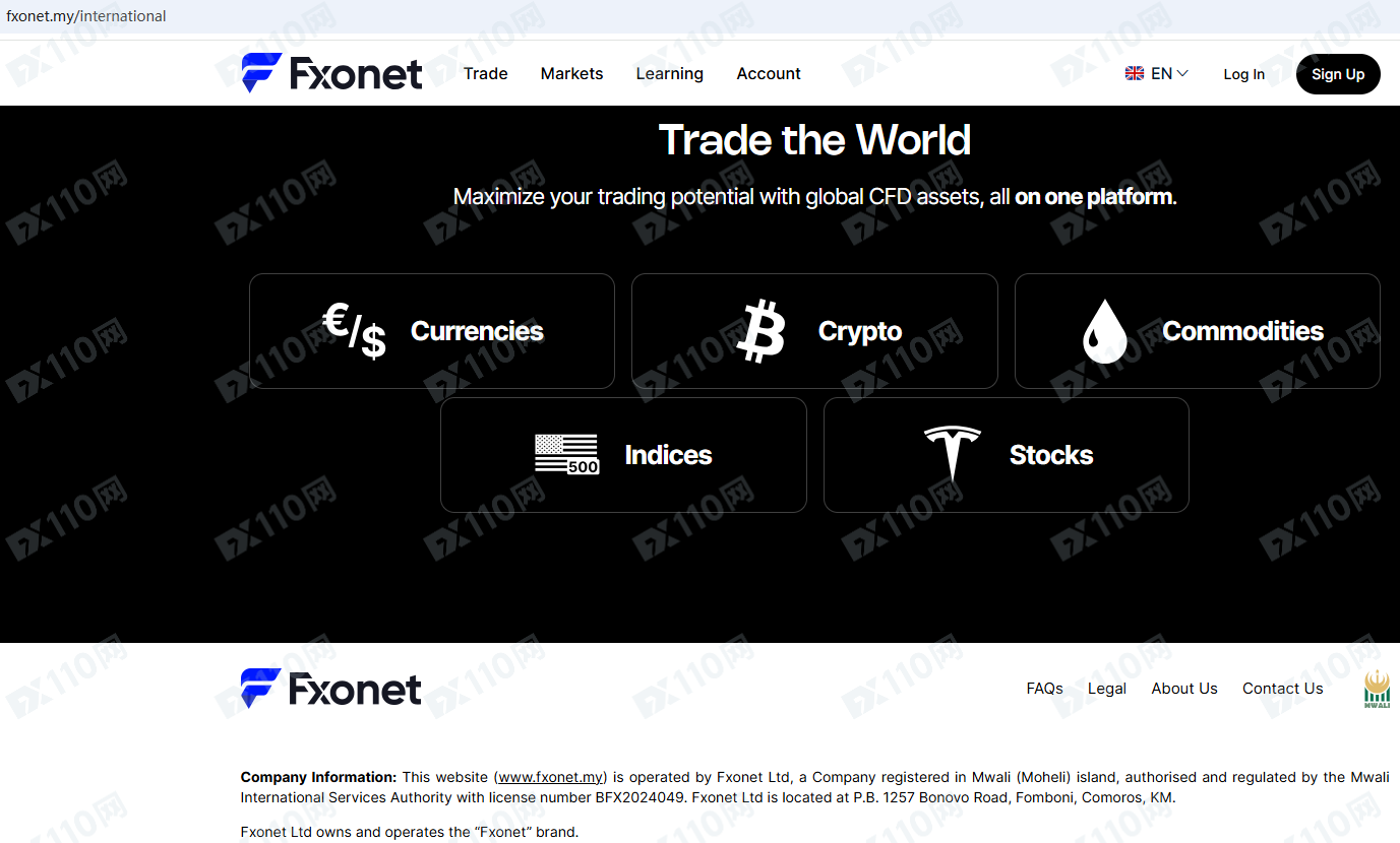 該平臺宣傳由Fxonet Ltd運營,在姆瓦利島 (莫埃利島) 注冊,并經姆瓦利國際服務管理局MISA授權和監管,許可證號為BFX2024049,提供外匯加密貨幣、大宗商品、指數、股票等金融衍生品投資交易服務。