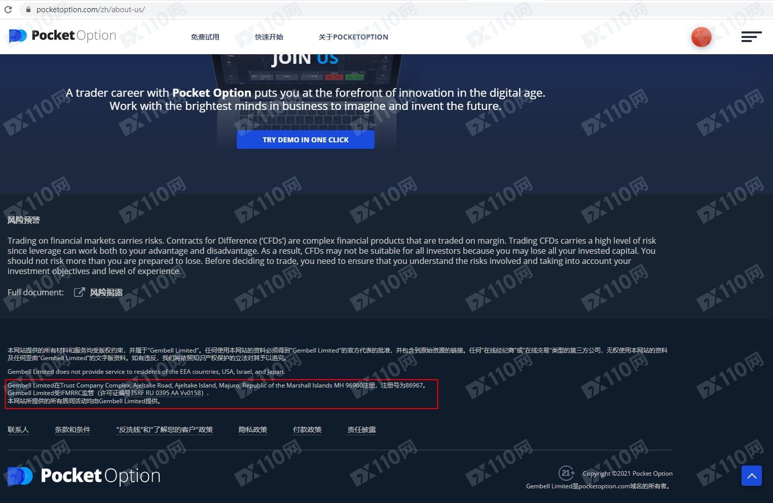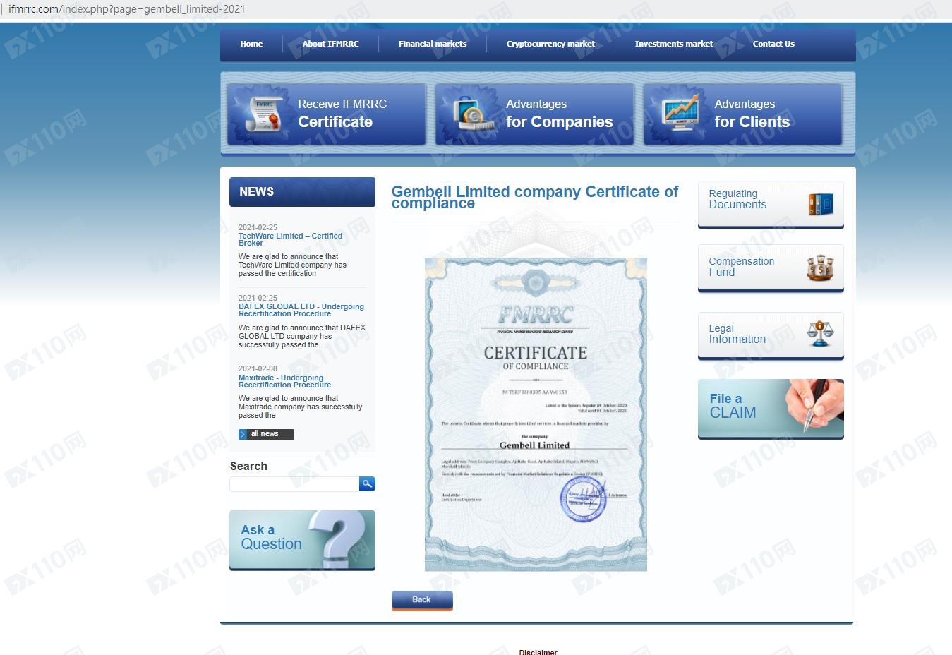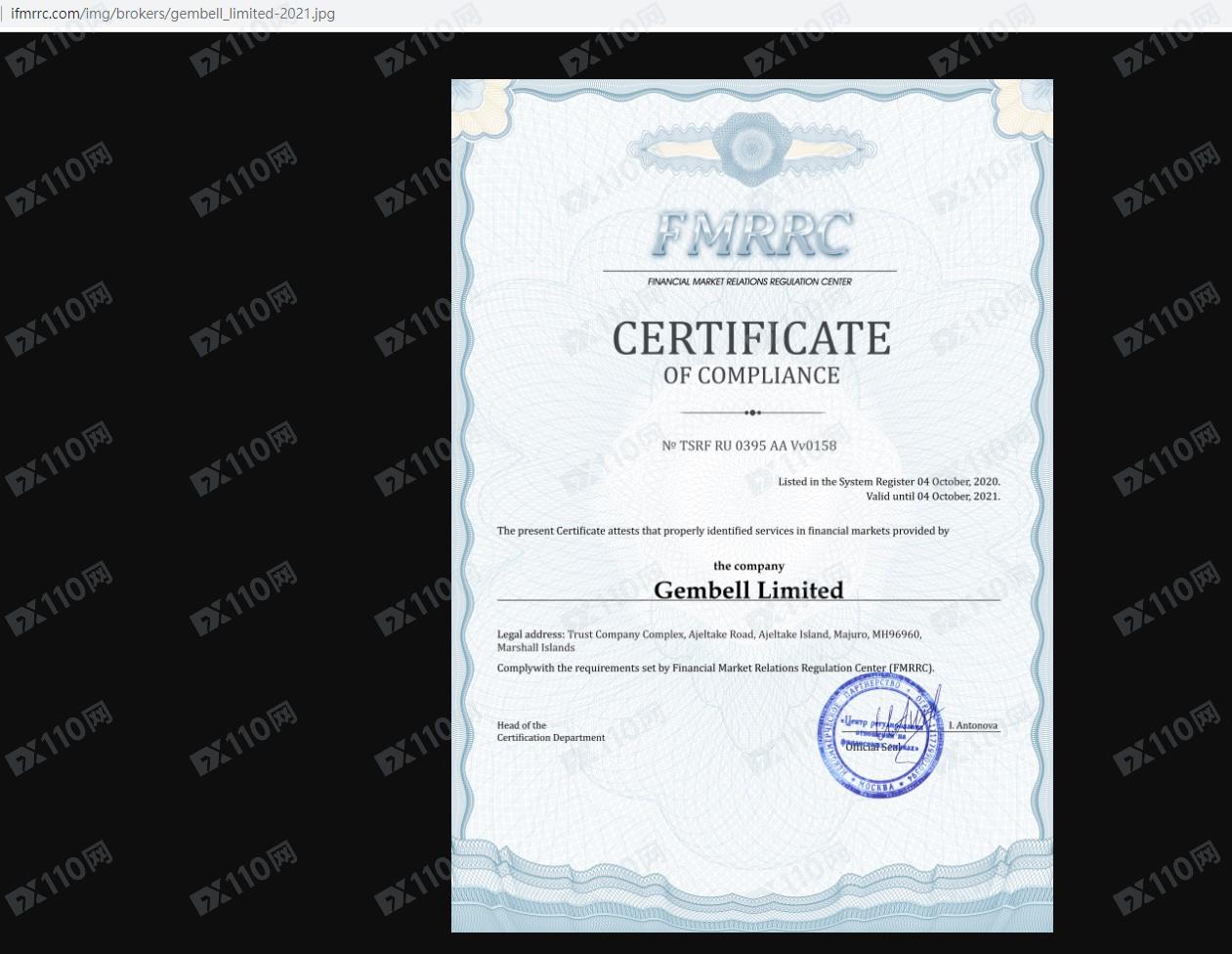 該平臺宣稱提供金融衍生品交易服務,由Gembell Limited運營,公司注冊地信息位于馬紹爾,注冊號:86967,受俄羅斯IFMRRC監管,證號:TSRF RU 0395 AA Vv0158。