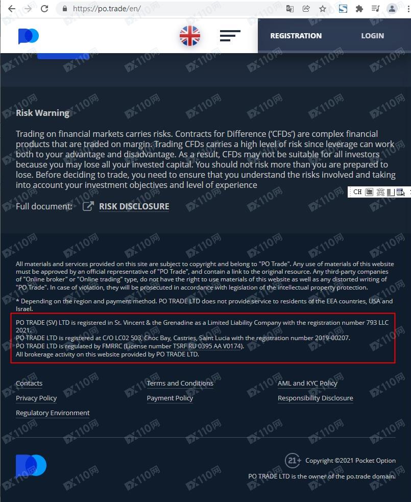 該平臺以同樣名稱運營的另一網址https://po.trade/en/。平臺宣稱由PO TRADE LTD運營,PO TRADE (SV) LTD註冊於聖文森特,註冊號793 LLC 2021、POTRADE LTD註冊於聖盧西亞,註冊號2019-00207,受IFMRRC監管,許可證號TSRF RU 0395 AA V0174。