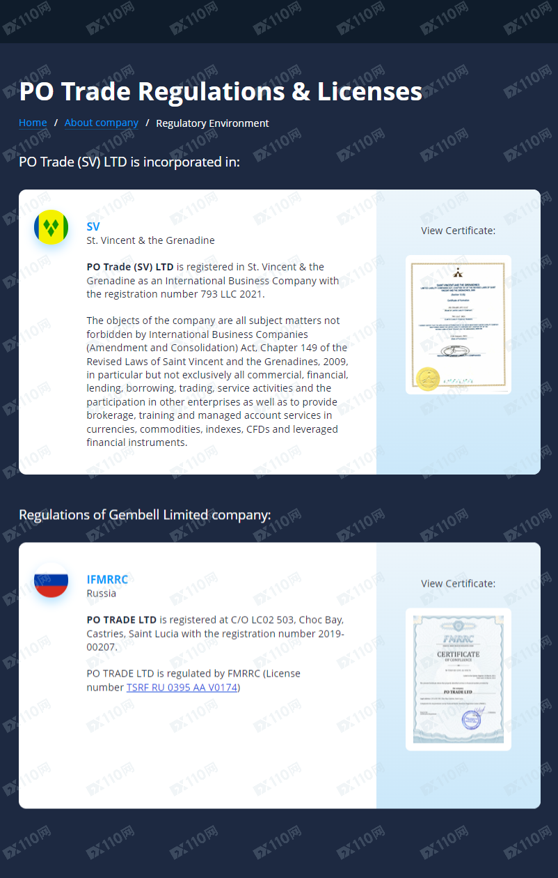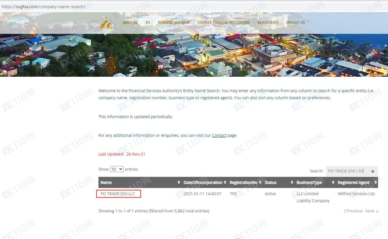 請注意,俄羅斯IFMRRC不是監管機構,不具監管效力。我們在聖文森特FSA有搜索到PO TRADE (SV) LLC的公司信息,但聖文森特FSA同樣不監管金融衍生品,顯然該平臺無任何監管。
