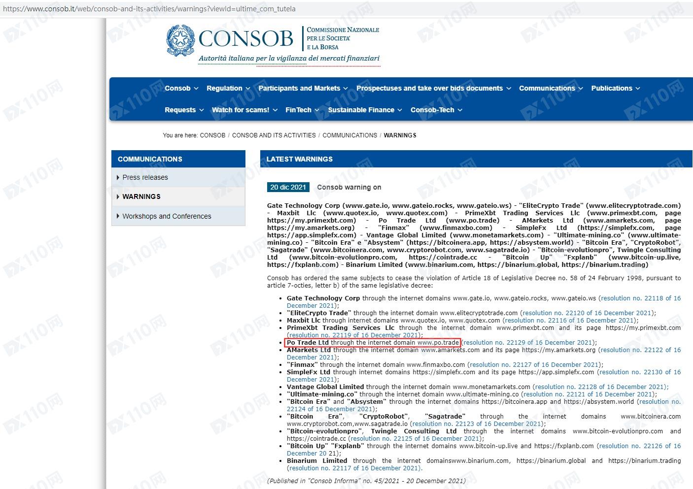 此外,該平臺已被意大利CONSOB列入警示,請遠離!