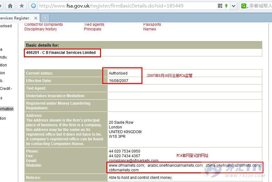 經查詢FCA,得知該監管號所對應的公司是:CB Financial Service Limited,于2007年8月16日注冊FCA監管號,且該公司在FCA登記的官方網址是:www.ofmarkets.com;arabic. onefinancialmarkets.com;china. onefinancialmarkets,com;cbfsmarkets.com.由此可見,該平臺是盜用其他公司監管號的虛假交易商!