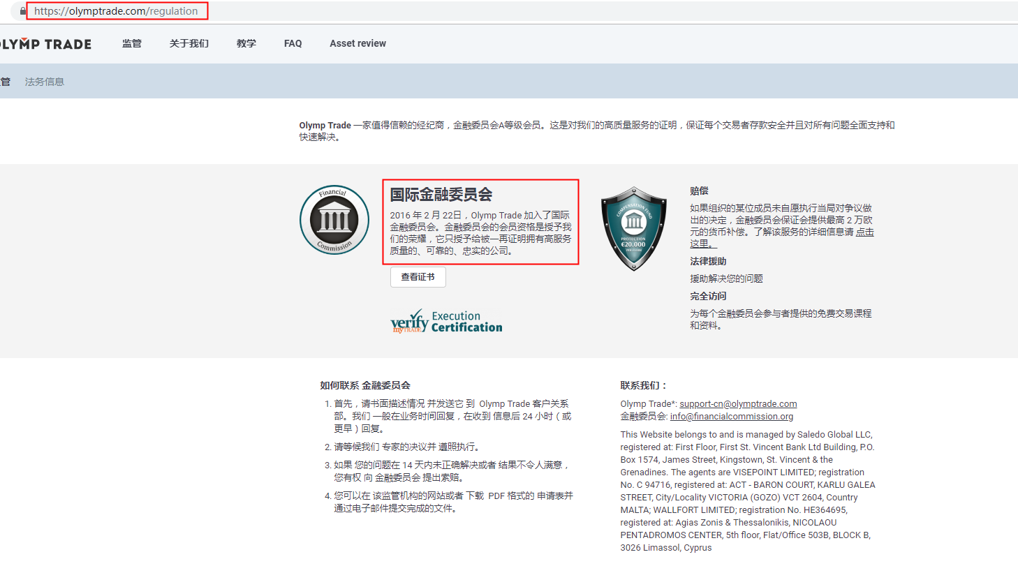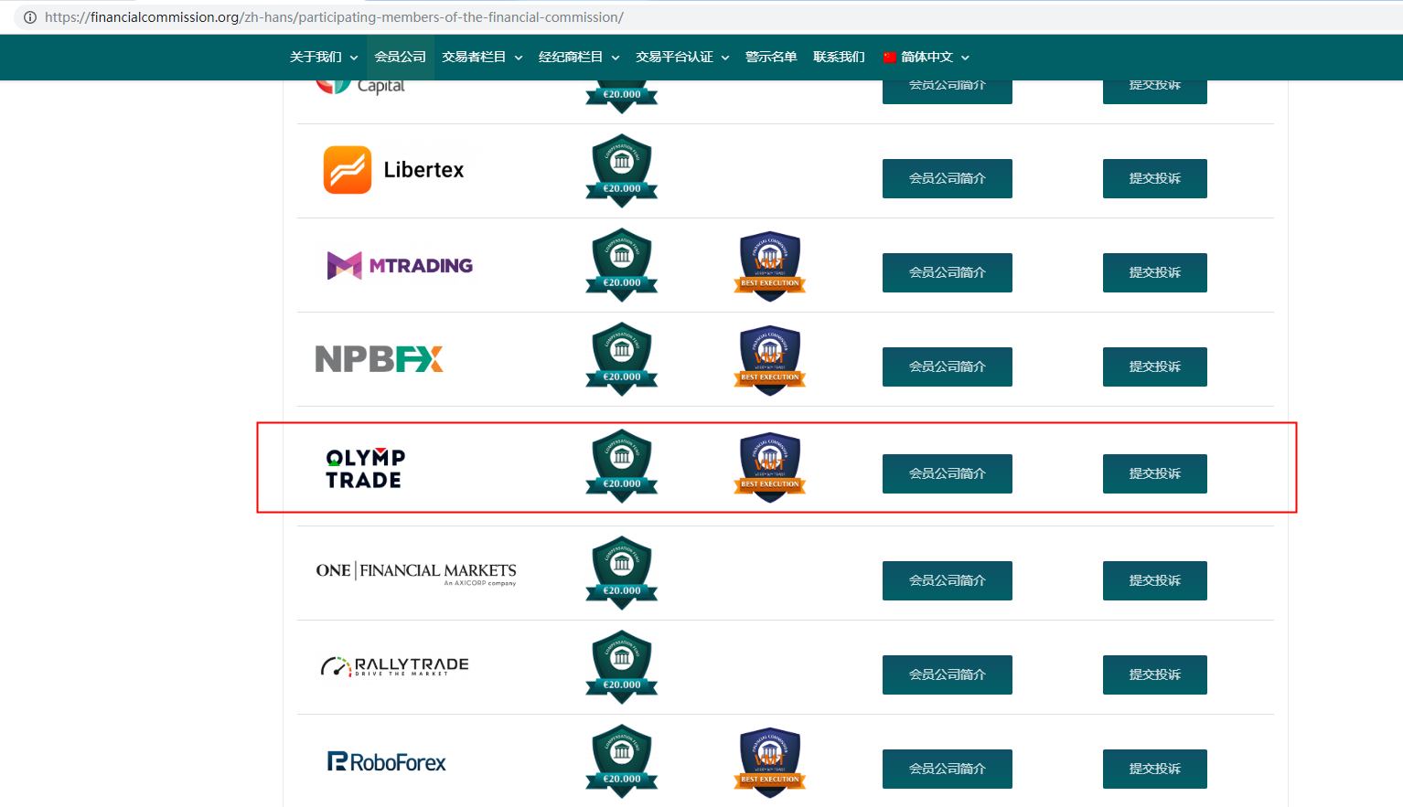 經查詢,我們在金融委員會的會員列表中查詢到對應平臺為:Olymp Trade。但是請注意,金融委員會僅為一家自律機構,不是監管!