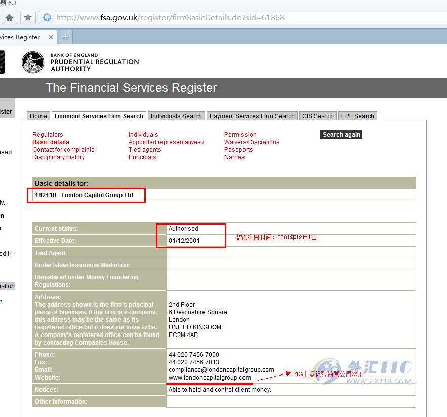 經查證,FCA182110所對應的公司是:London Capital Group Ltd,于2001年12月1日注冊監管,并且登記的網址是:www.londoncapitalgroup.com。同時我們工作人員電話FCA真正受監管的公司,得知其在亞洲沒有分公司。很顯然,該平臺是盜用其他公司FCA監管號的虛假交易商!