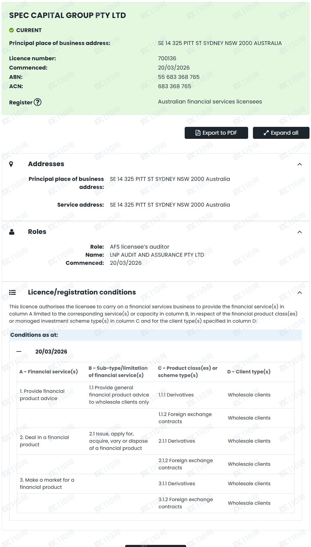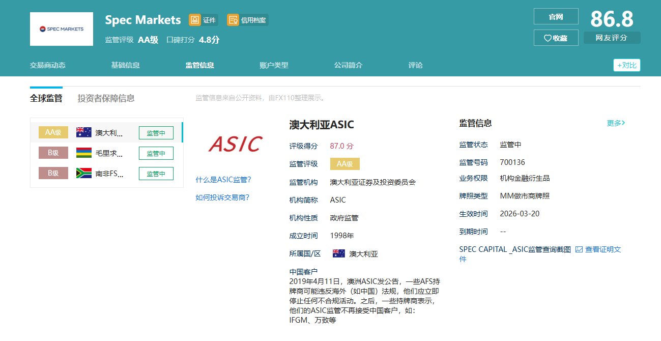 FX110獲悉,Spec Capital Group已獲得澳洲證券和投資委員會(ASIC)頒發的澳洲金融服務(AFS)牌照(牌照編號:700136),允許其澳洲實體Spec Capital Group Pty Ltd向批發客戶提供服務。 Spec Markets是Spec Capital Ltd的交易名稱。