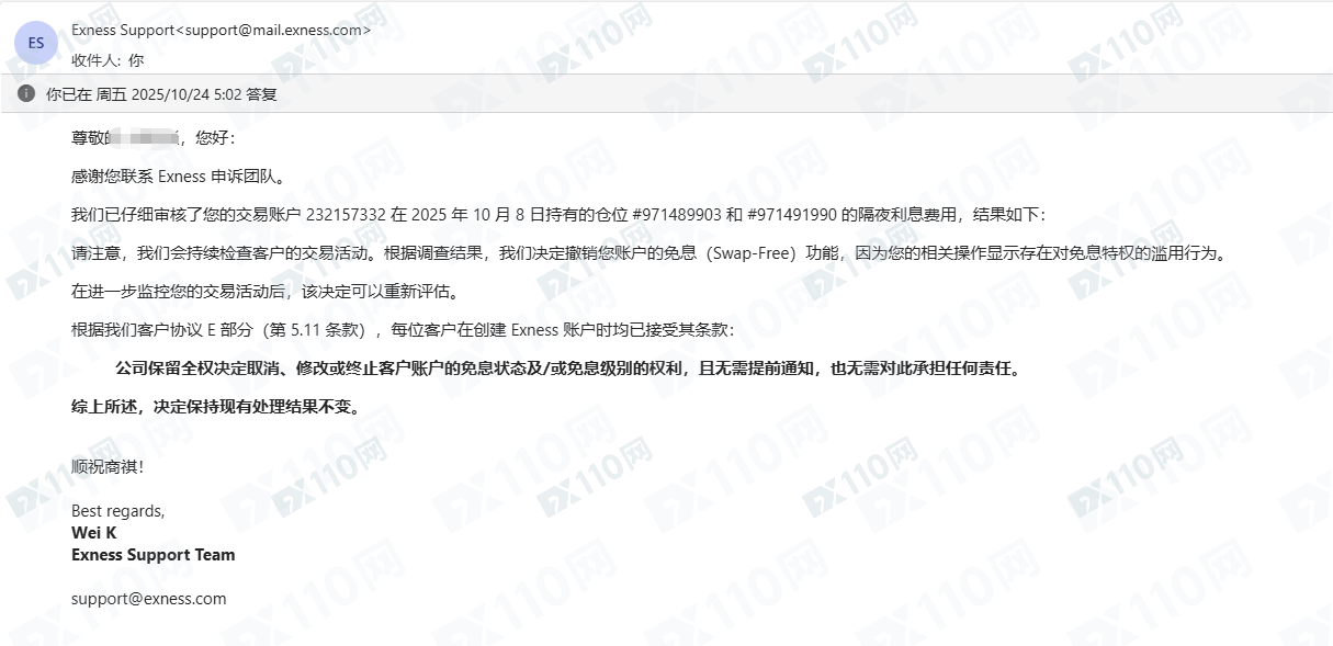 在Exness上交易, 突然在十月八日週四早上在沒有通知的情況下被收取了588美金的隔夜費, 與EX客服半個月後才回复說我濫用了免息條例,可笑嗎?多單被在沒通知的情況下被收取了隔夜費, 空單隔夜費EX怎麼從來沒付過, EXNESS這個平台已經跟強盜沒區別了。在這個平台上輸了這麼多, 規矩全是他定的,要求退還我的庫存費, 這種平台請遠離。